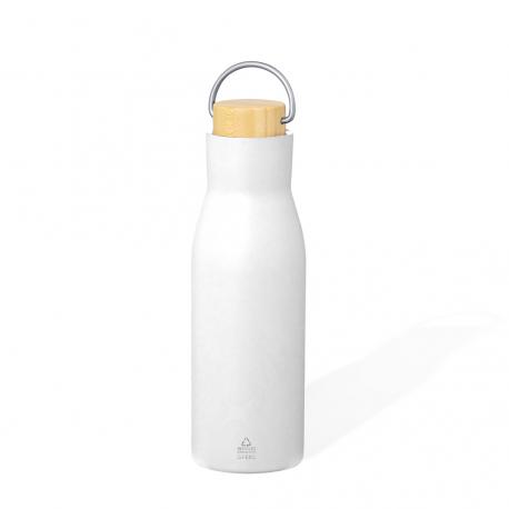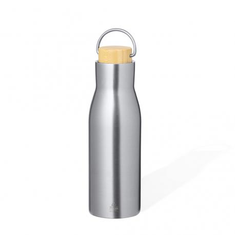 Bidón térmico de 500 ml de capacidad, fabricado en Acero Inox Reciclado de doble pared. Incluye original tapón a rosca en acero inox con detalle de bambú y asa integrada. Disponible en variada gama de colores mate y presentado en caja individual de diseño kraft.