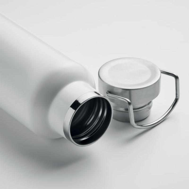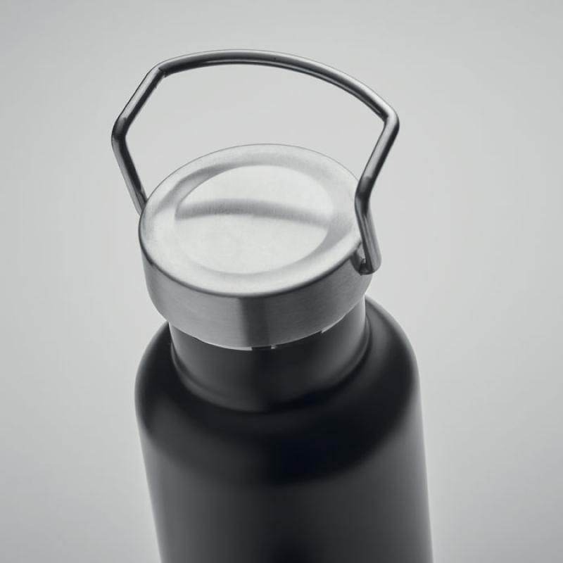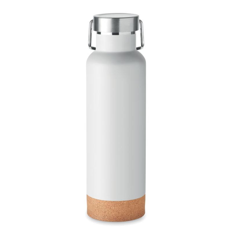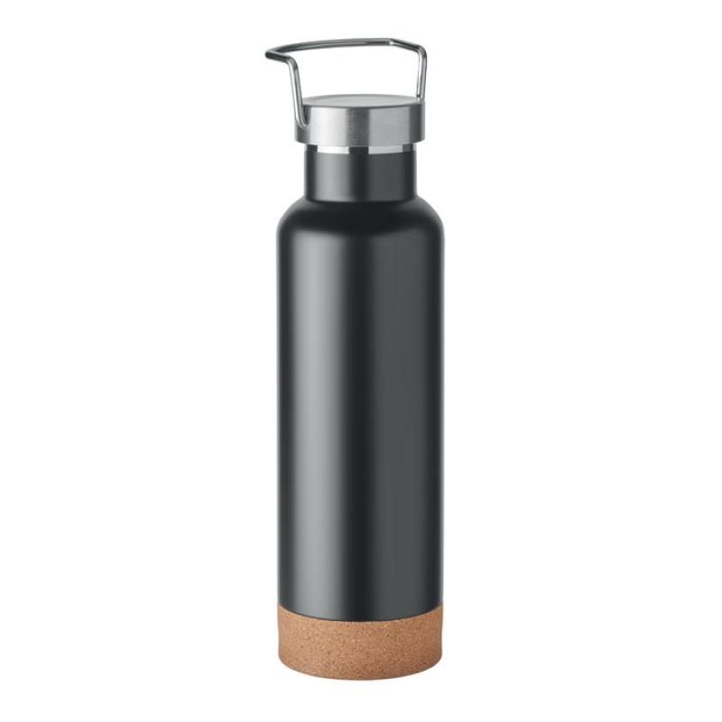 Botella de doble pared aislado al vacío de acero inoxidable reciclado con tapa con asa y base con detalle de corcho. Anti fugas. Capacidad: 500 ml. (90% de acero inoxidable reciclado y 10% de acero inoxidable).Recipiente :