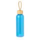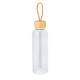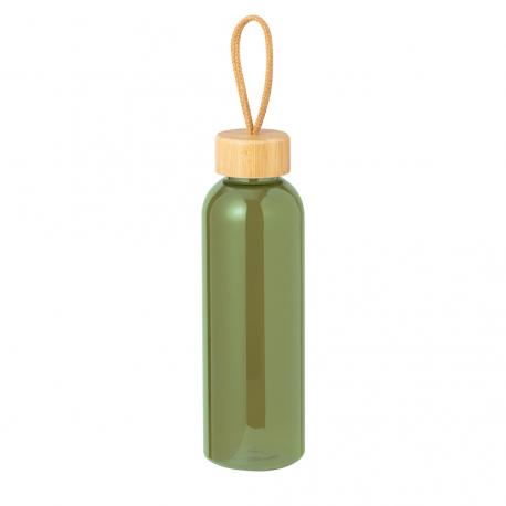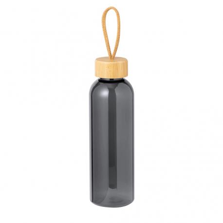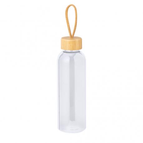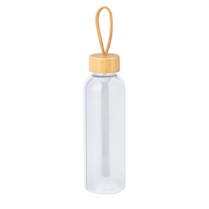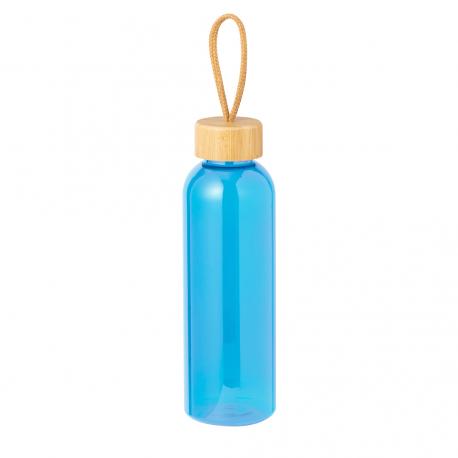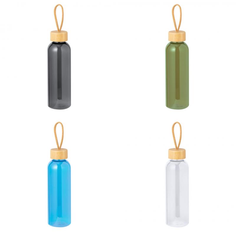 Bidón fabricado en RPET de 650 ml de capacidad, libre de BPA. Tapón a rosca en bambú, con cordón de transporte trenzado. Disponible en variada gama de colores. Presentado individualmente en bolsa de papel.