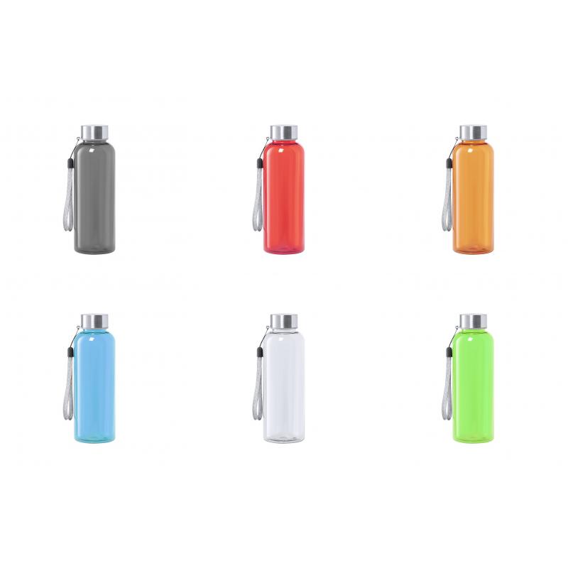 Bidón de 500ml de capacidad. Libre de BPA, con cuerpo fabricado en tritán transparente y de alta resistencia al calor. Tapón a rosca en acero inox, con cordón de transporte. Disponible en variada gama de colores.