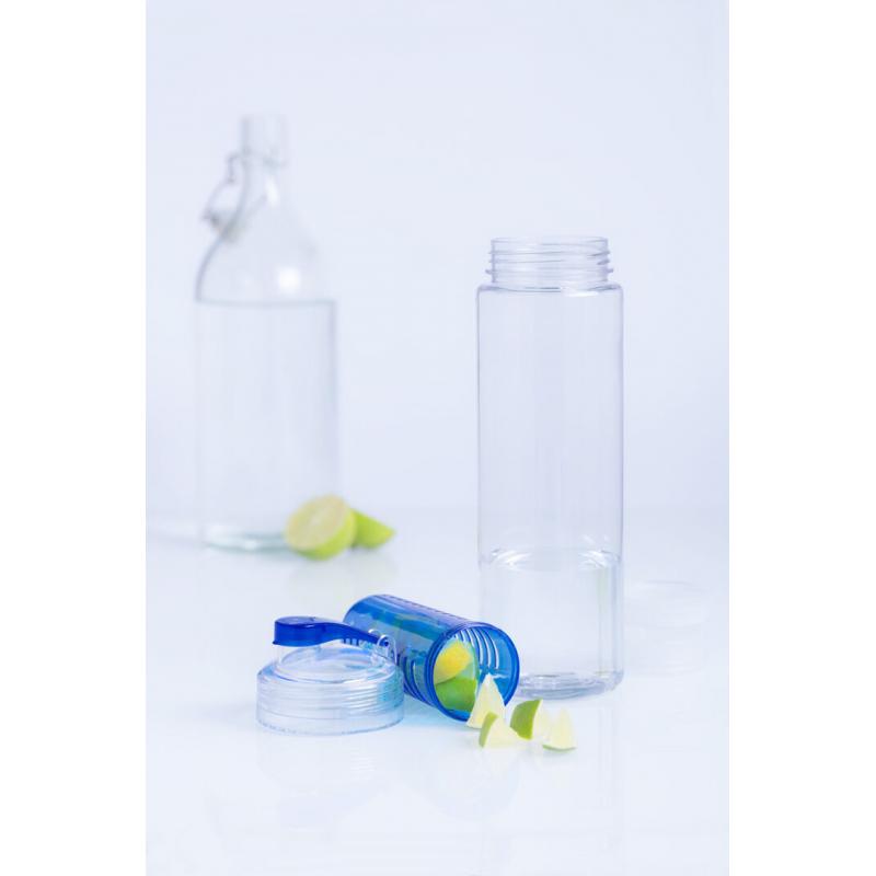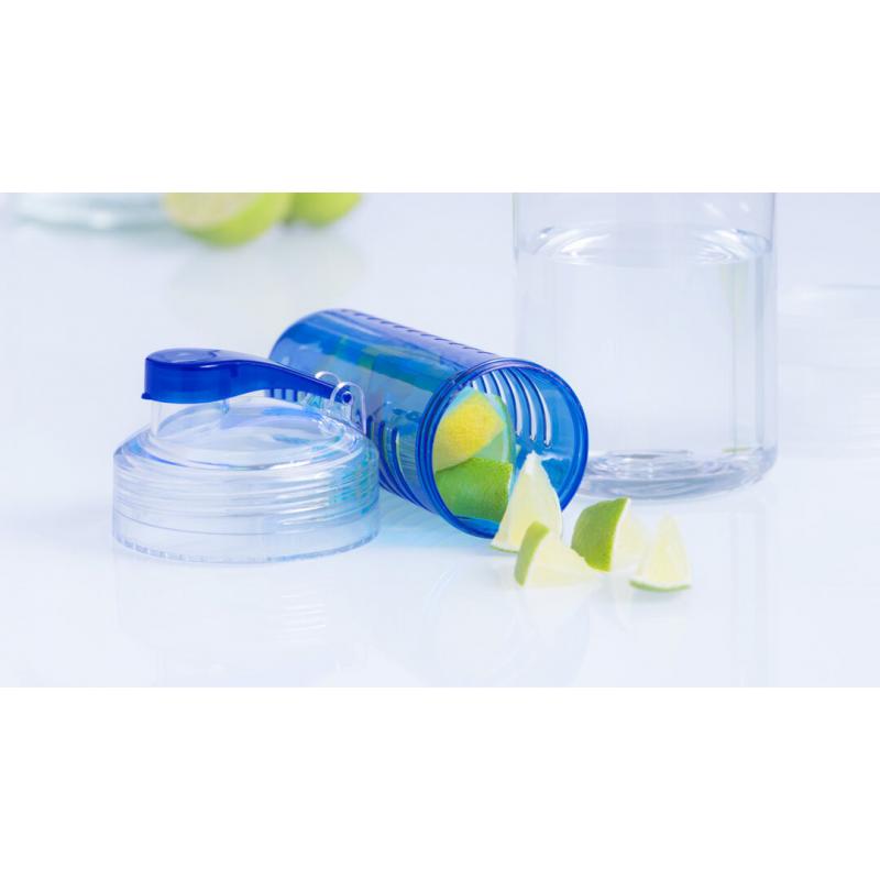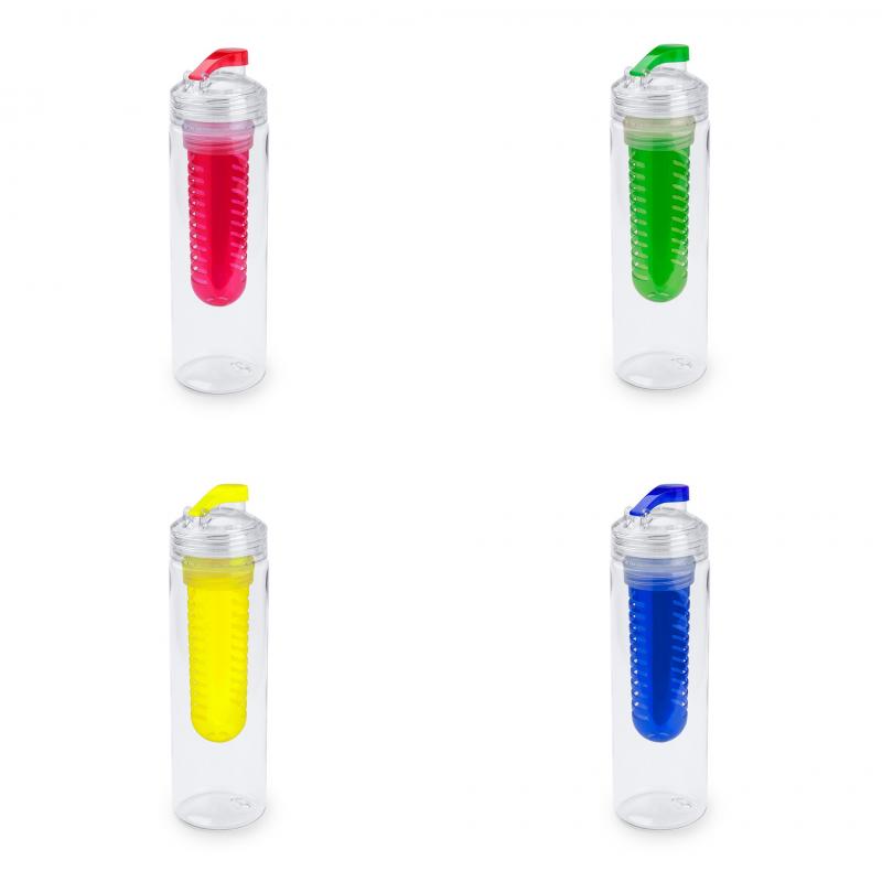 Bidón de 700ml de capacidad en material tritán resistente al calor. Con dosificador de seguridad y tapón a rosca con accesorio enfriador en vivos colores. Presentado en caja individual.