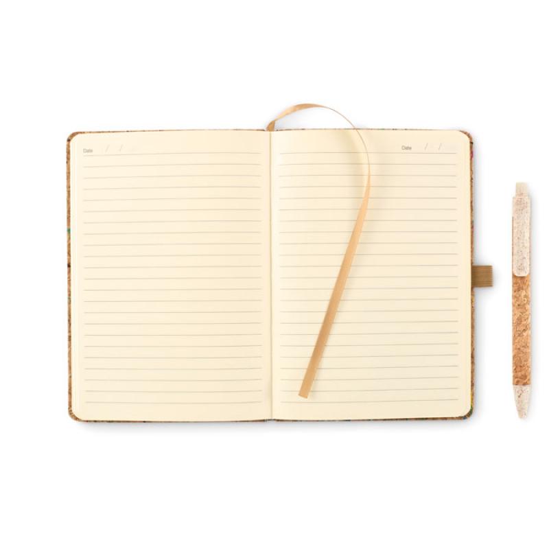 Libreta A5 con tapas de corcho duro coloreado. 96 hojas rayadas. Banda elástica, marca páginas y porta bolígrafos elástico.Recipiente :