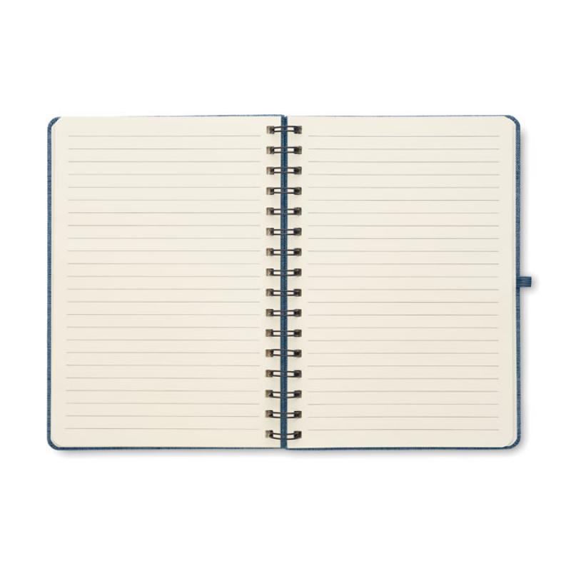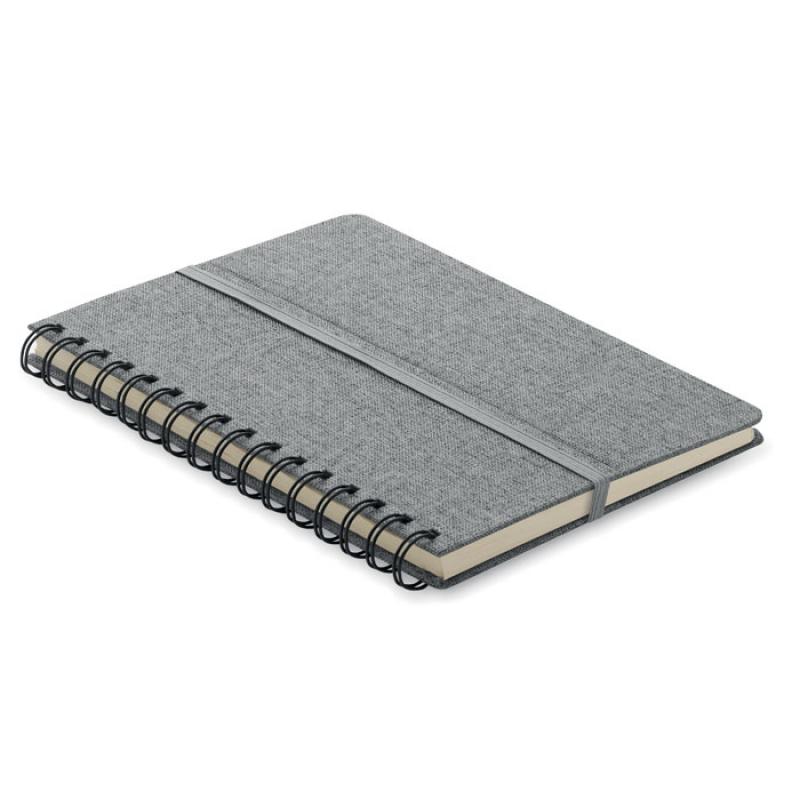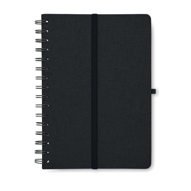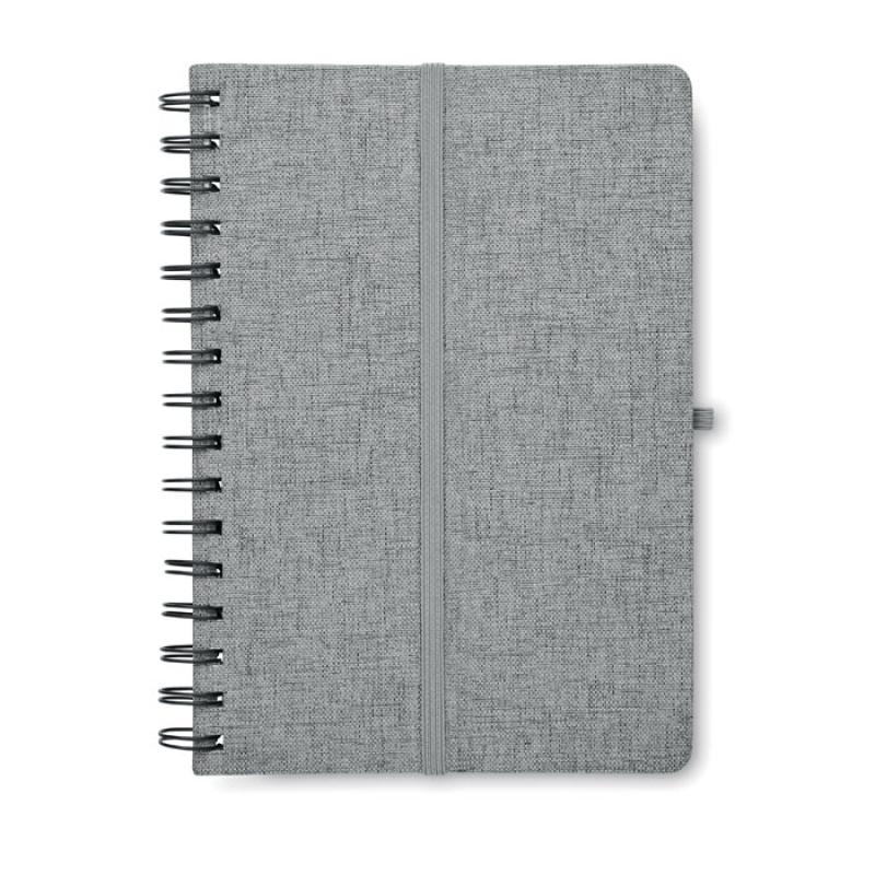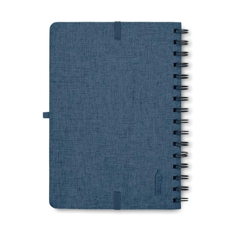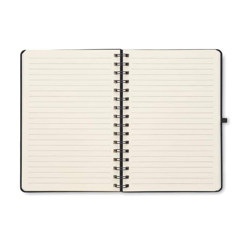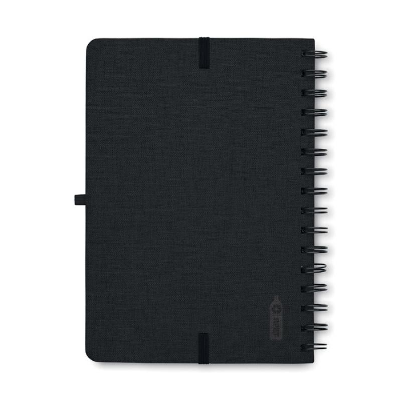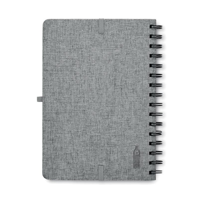 Libreta A5 de anillas con tapa dura de RPET 600D con función de soporte para smartphone. Doble hilo. 160 páginas rayadas (80 hojas). papel reciclado de 70 g/m². Banda elástica de cierre.Recipiente :