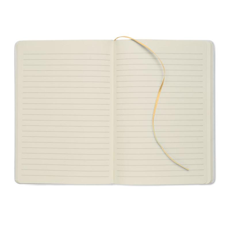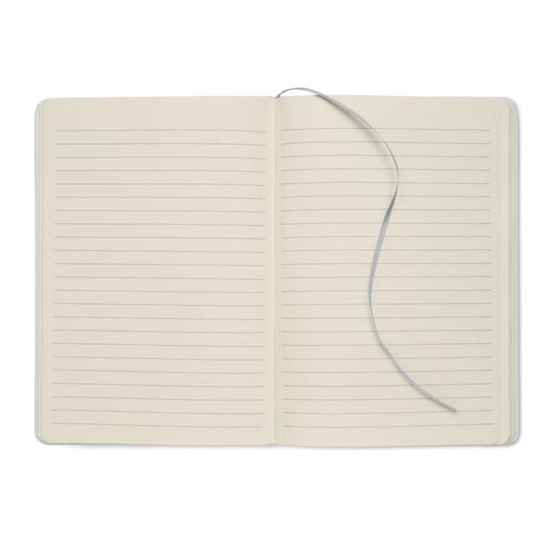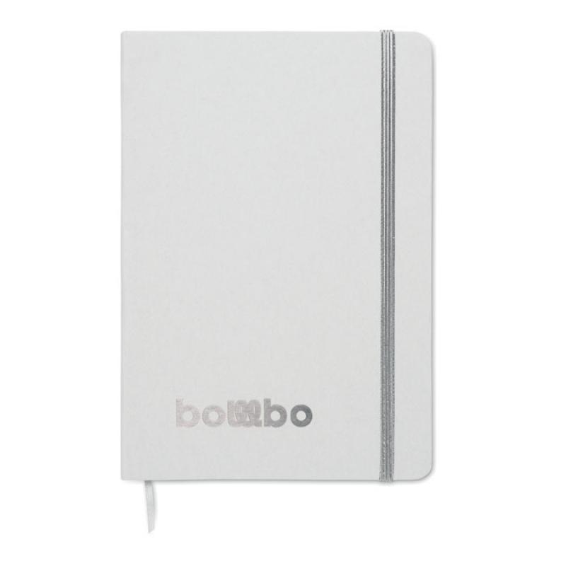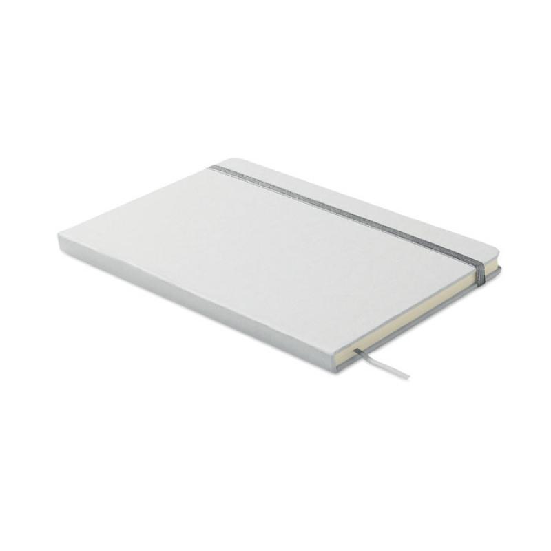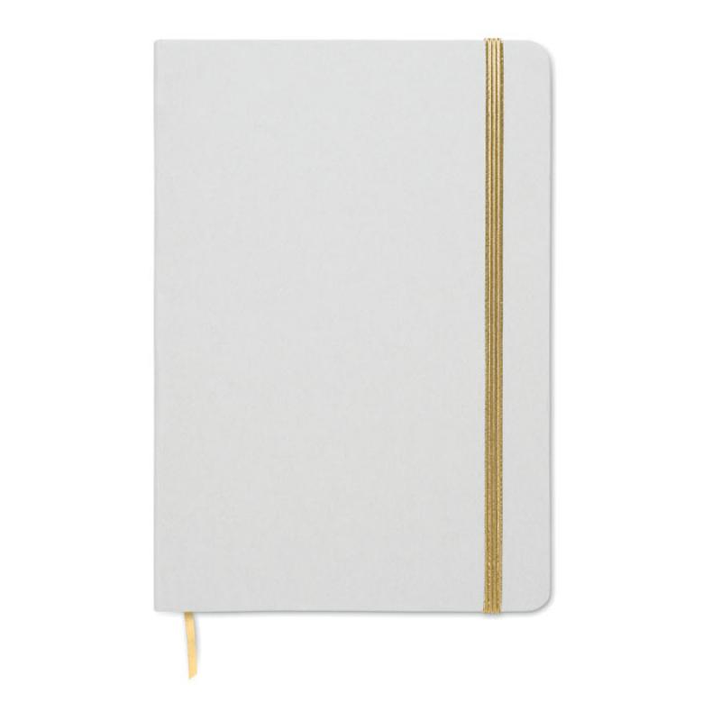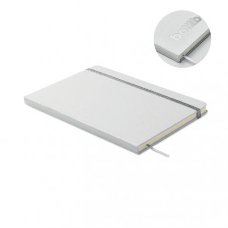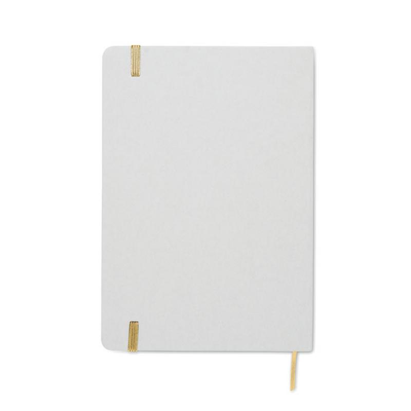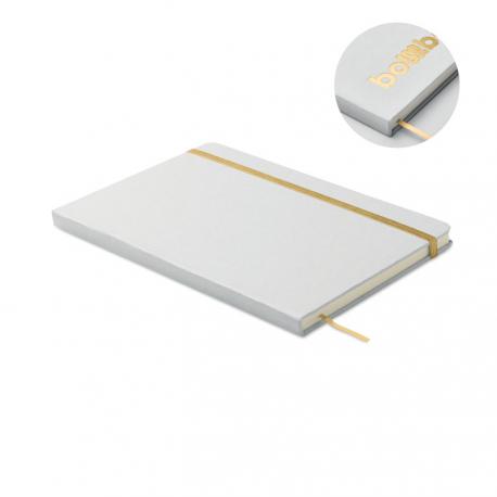 Libreta A5 con tapa de cartón duro reciclado. Cubierta blanca. 160 páginas de papel reciclado rayado (80 hojas). Incluye banda elástica y cinta marcapáginas a juego. Si se graba en láser, saldrá el color brillante de debajo a juego en la impresión.Recipiente :