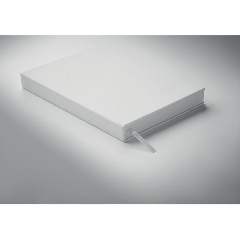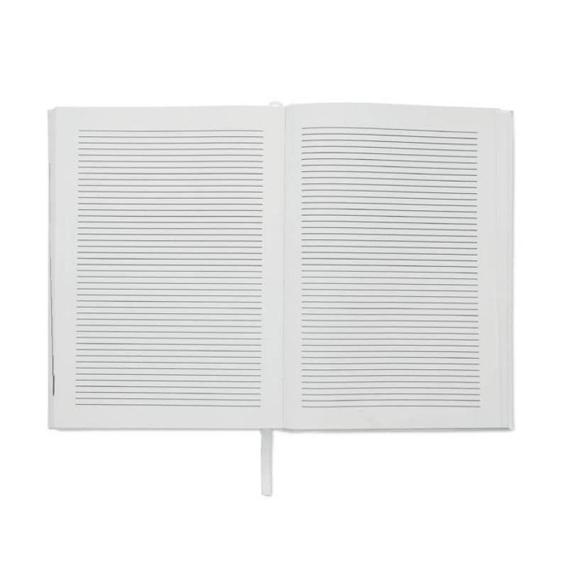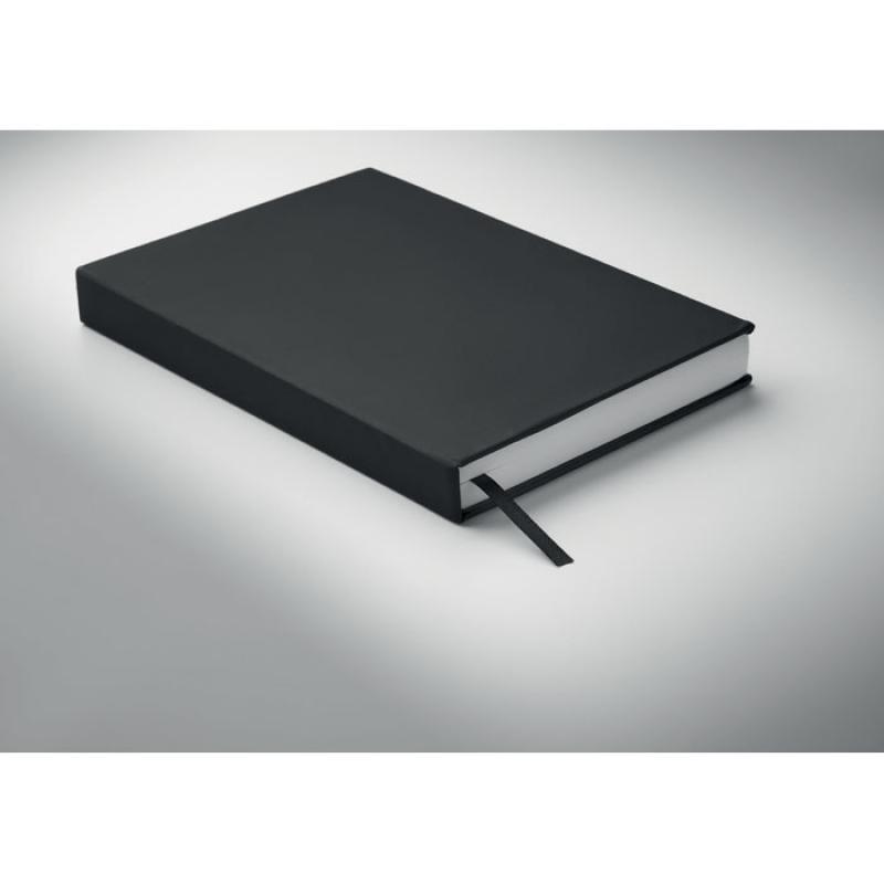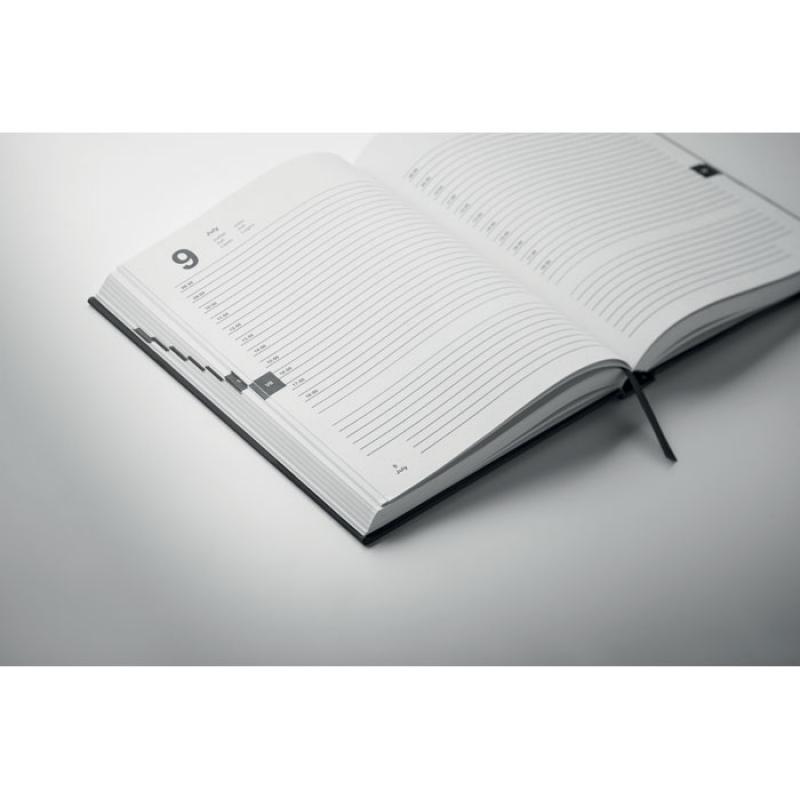 Libreta A5 con agenda perpetuo dia pagina en poliéster postconsumo reciclado 60% y tapa PU 40%. 416 páginas universales en papel reciclado de 70 g/m² (208 hojas). Con marcapáginas de cinta de poliéster del mismo color.Recipiente :