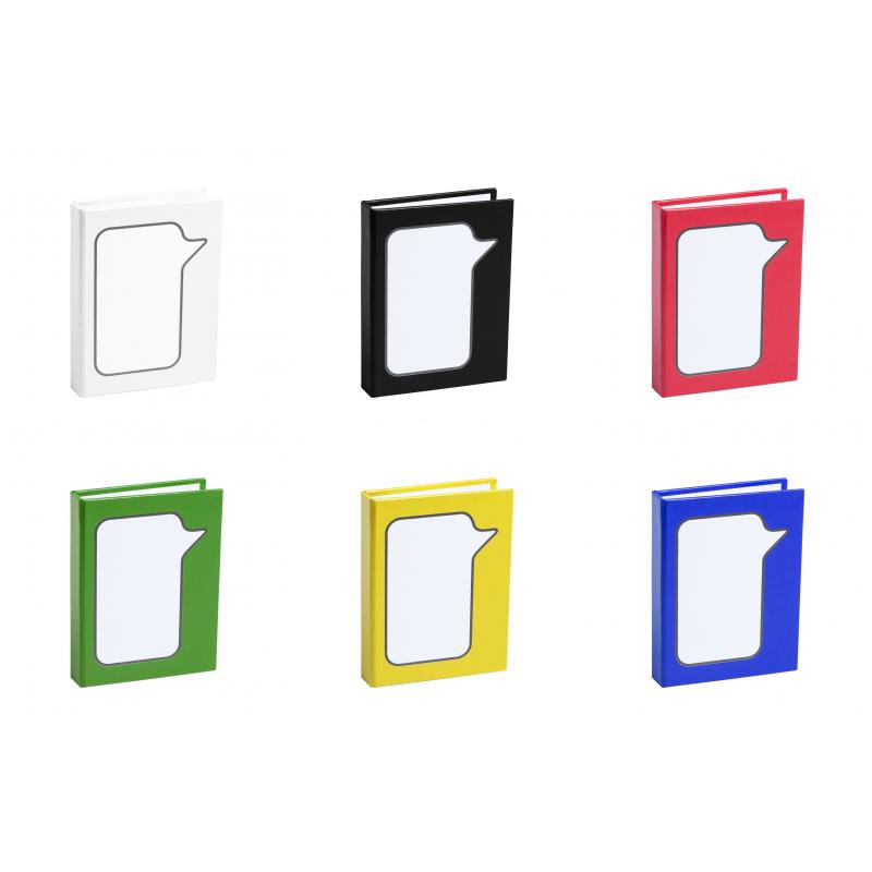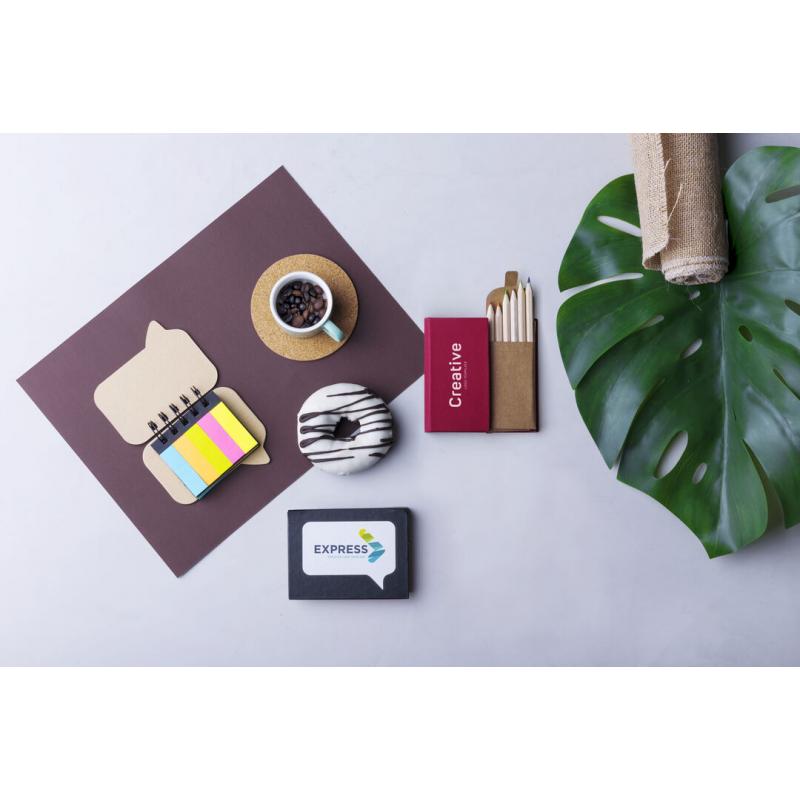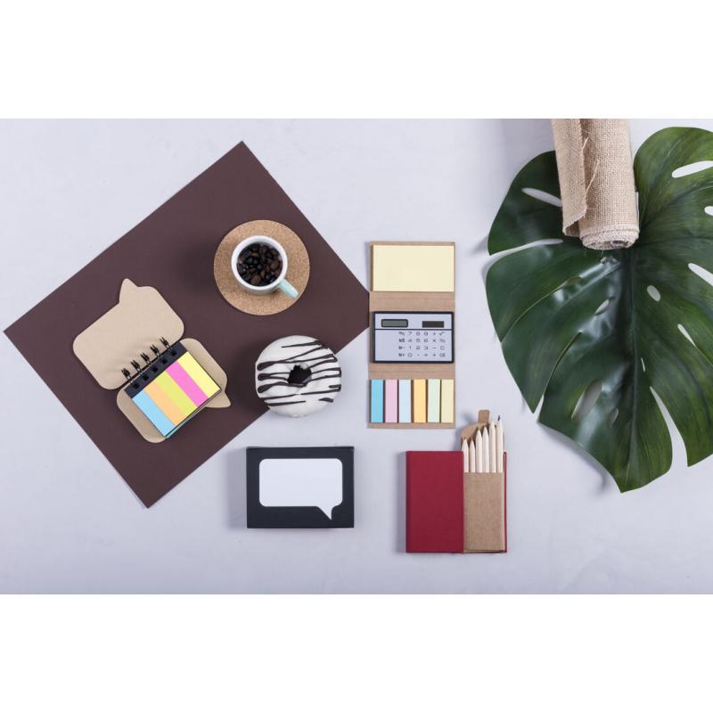Original bloc de notas adhesivas con diseño de bocadillo y tapas de suave tacto acabadas en resistente cartón reciclado rígido de variados colores. Con 100 notas adhesivas grandes troqueladas en forma de bocadillo, 25 medianas y 125 mini notas adhesivas.