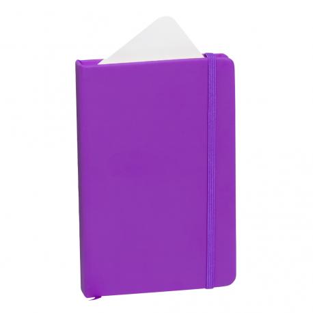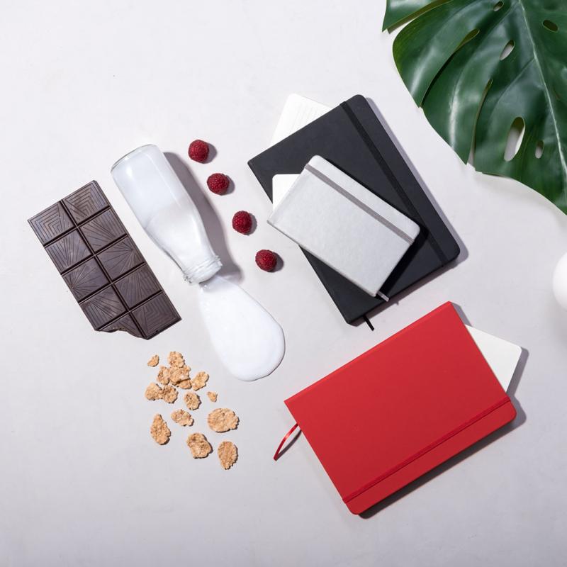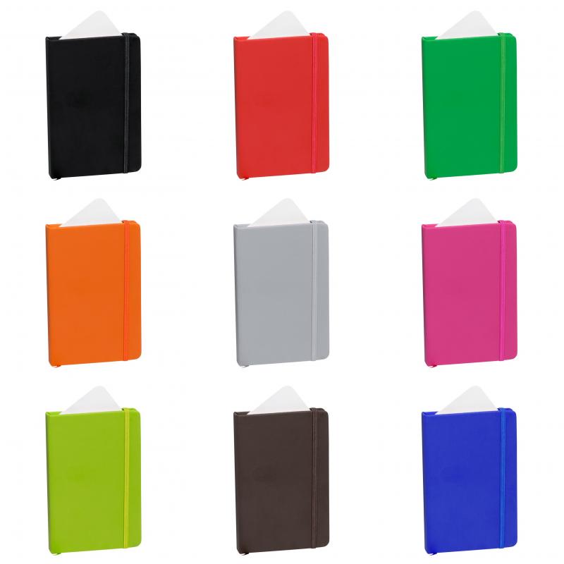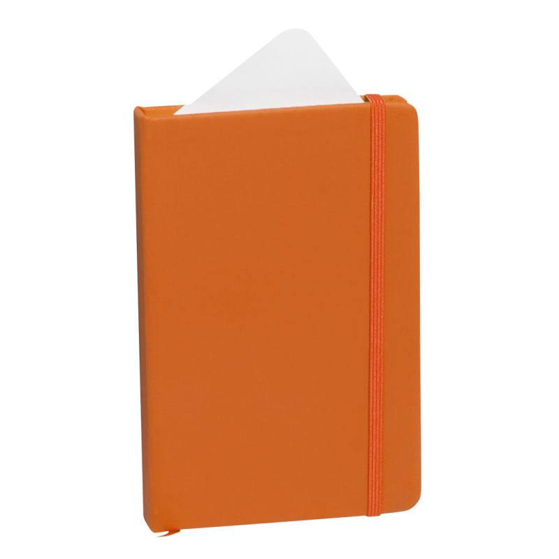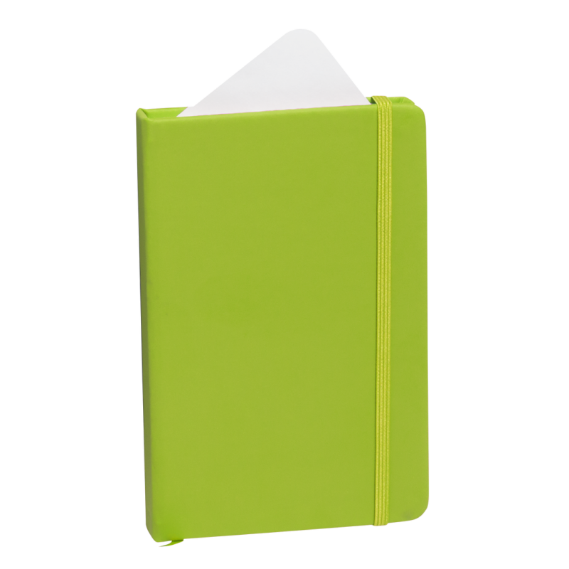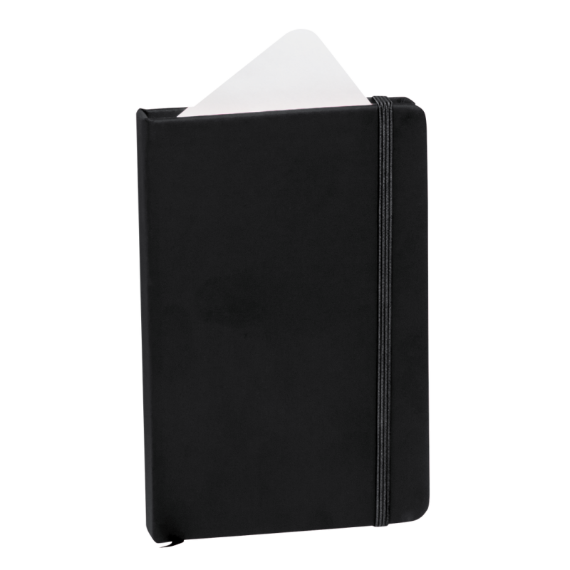 Bloc de notas con tapas duras fabricado en polipiel de suave tacto. Con marcapáginas disponible en variada gama de colores y elástico de cierre a juego. Interior con 100 hojas lisas.