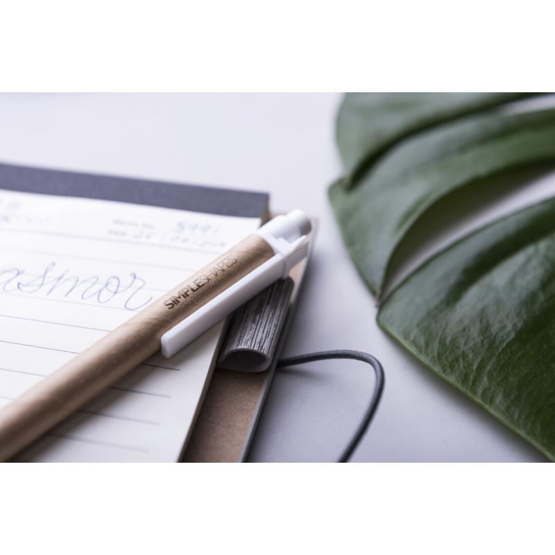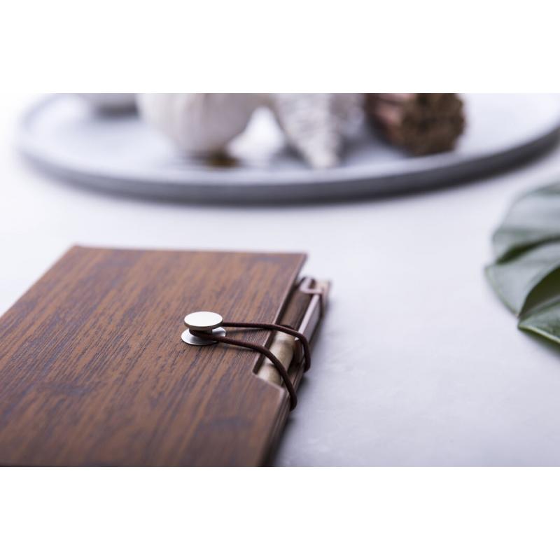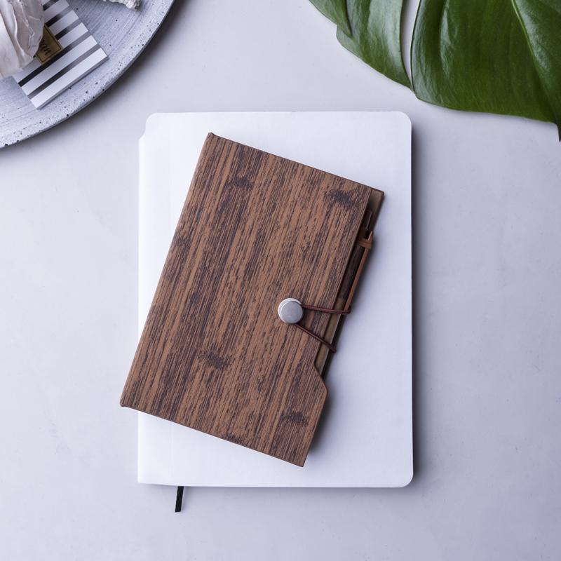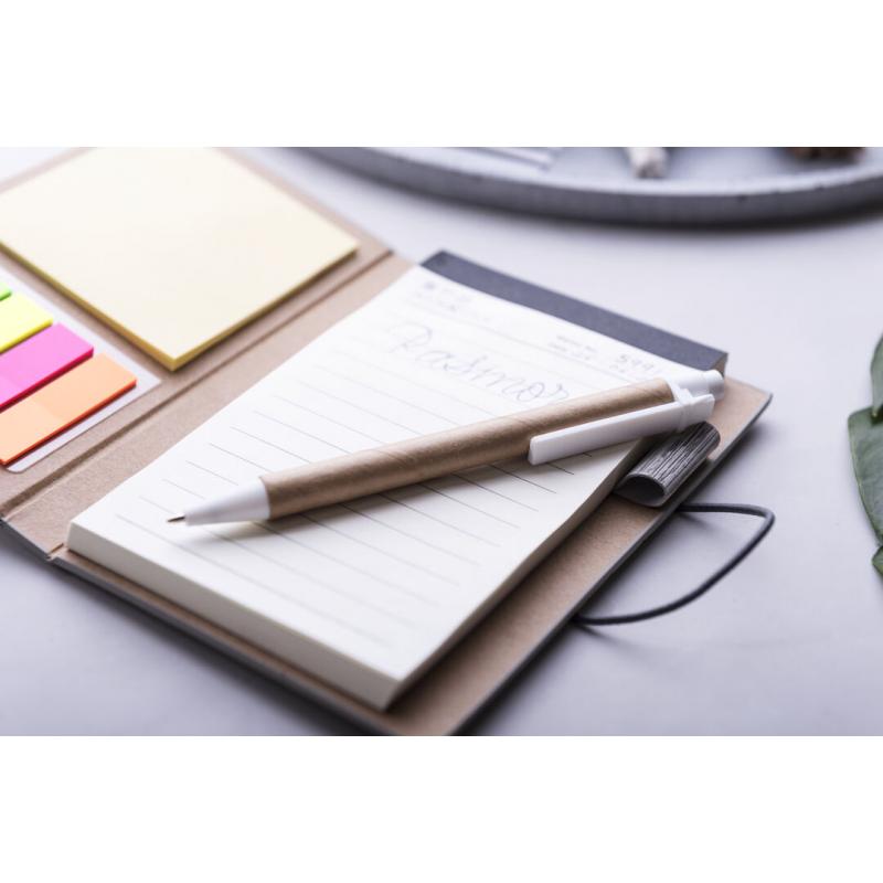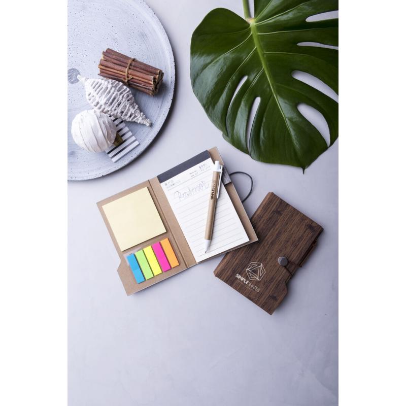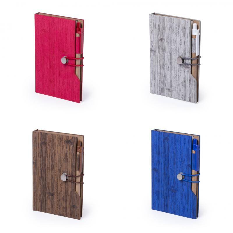 Bloc de notas en original polipiel veteada símil madera y en amplia gama de colores. Con bolígrafo de cartón reciclado incluido. De diseño ecológico, con tapas de suave tacto y cierre de elástico. Con soporte para el bolígrafo integrado, bloc de 70 hojas con distribución a una raya, 25 notas adhesivas medianas y 125 mini notas adhesivas.