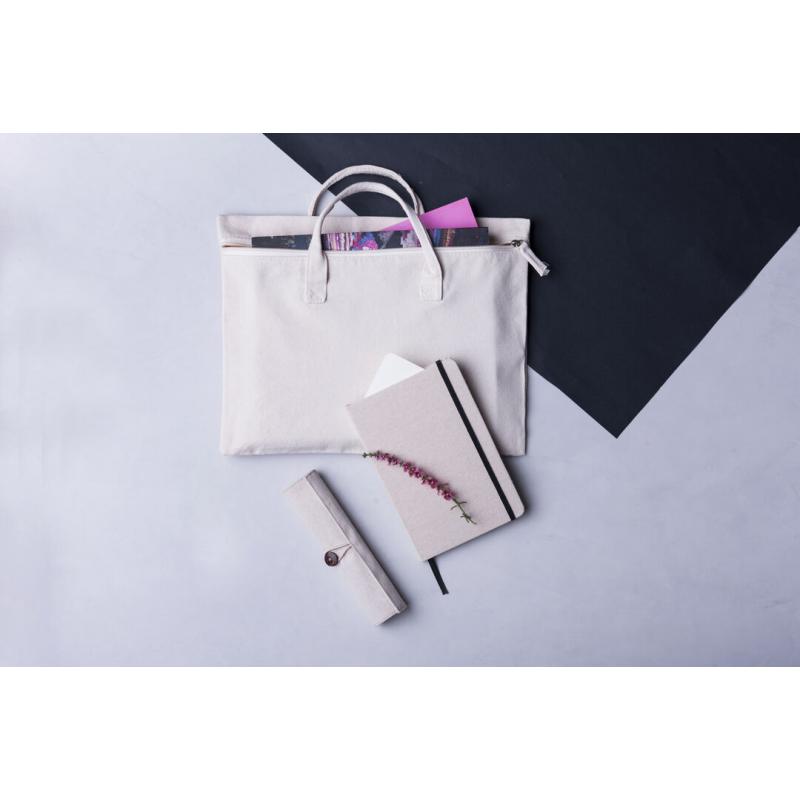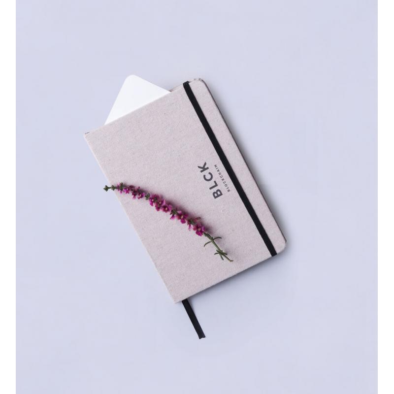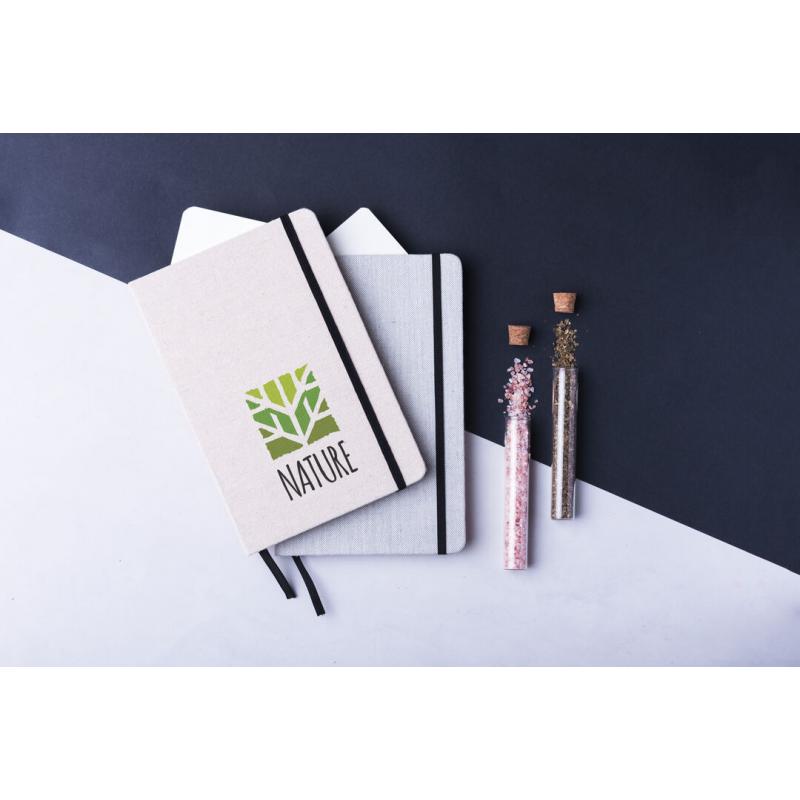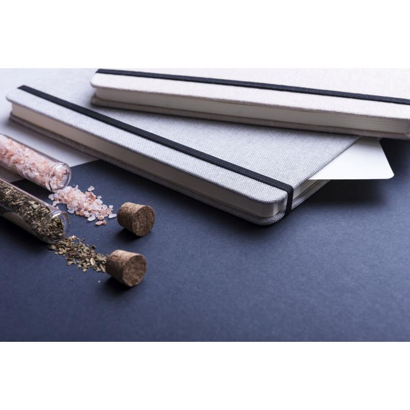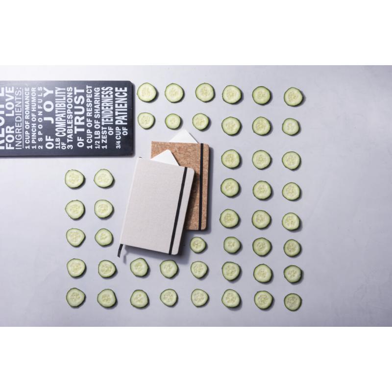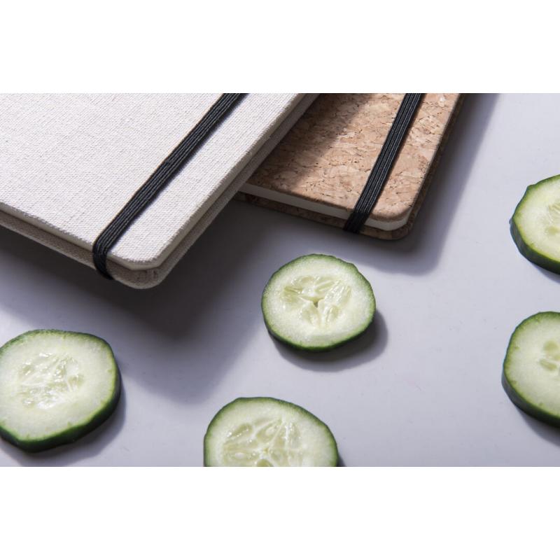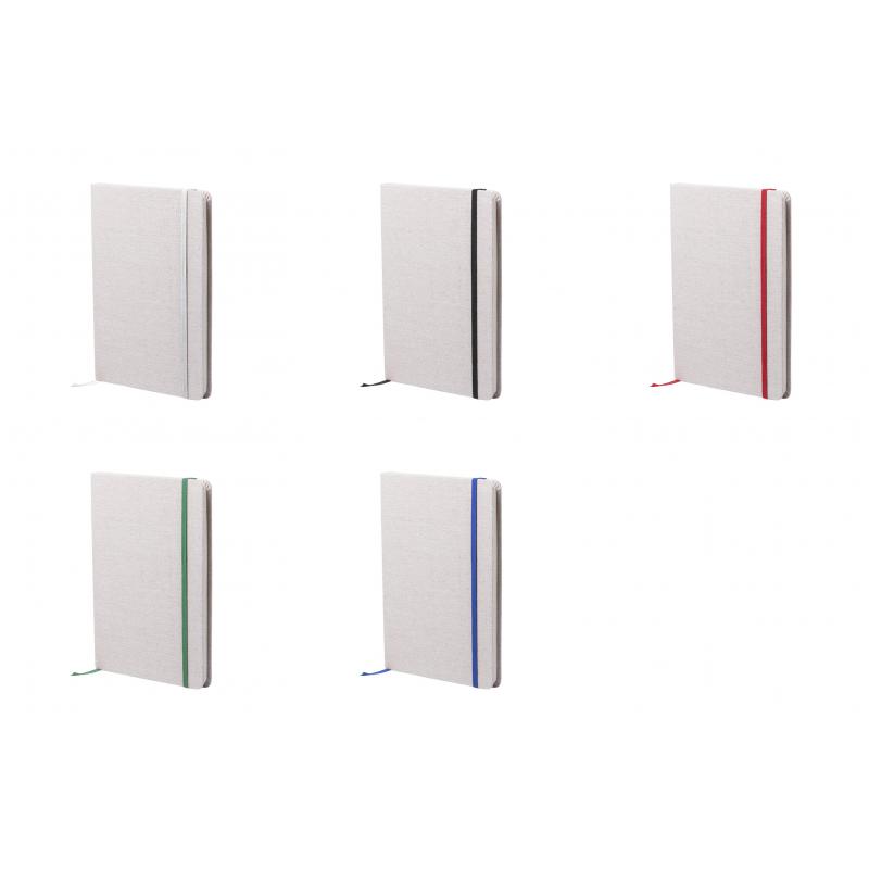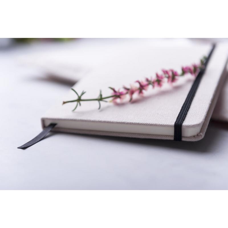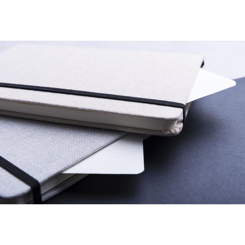 Bloc de notas de materiales naturales. Tapas en suave algodón de color crudo, con elástico de cierre y marcapáginas a juego en vivos colores. Incluye 80 hojas lisas.