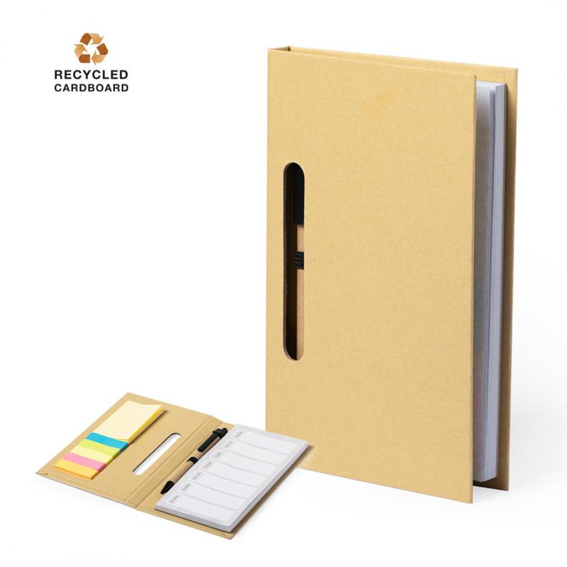 Set de bloc de notas y bolígrafo en línea nature con planificador semanal perpetuo. Tapas rígidas en cartón reciclado con soporte para bolígrafo y 60 hojas de planificación semanal. Incluye 25 notas adhesivas medianas y 125 mini-notas adhesivas. Con bolígrafo de mecanismo pulsador y cuerpo en cartón reciclado-tinta azul-.