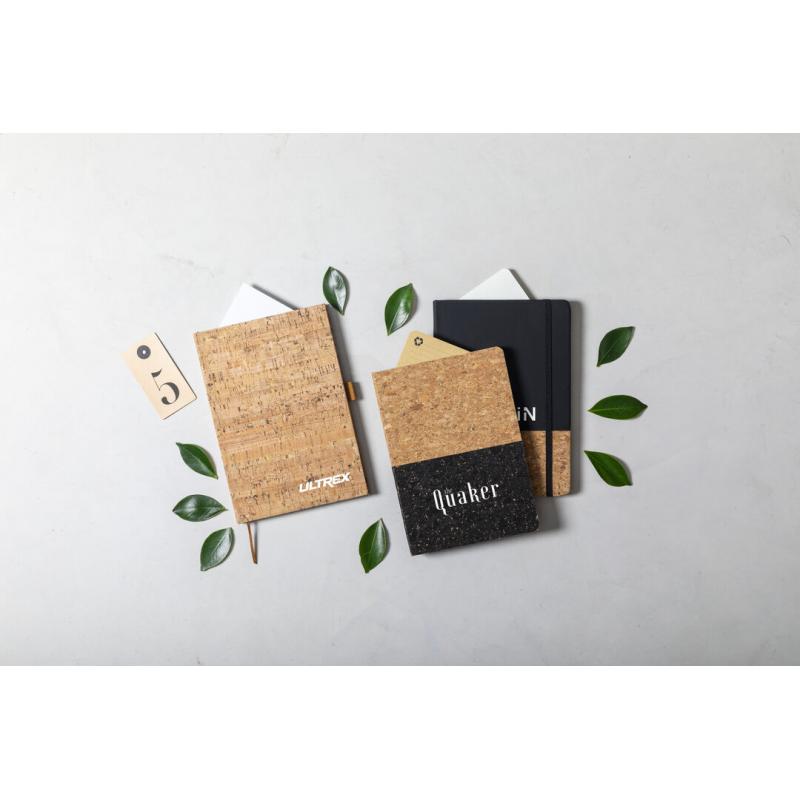 Bloc de notas de línea nature con tapas duras en corcho natural, de sobrio diseño. Incluye 100 hojas blancas lisas, con marcapáginas y soporte para bolígrafo a juego.