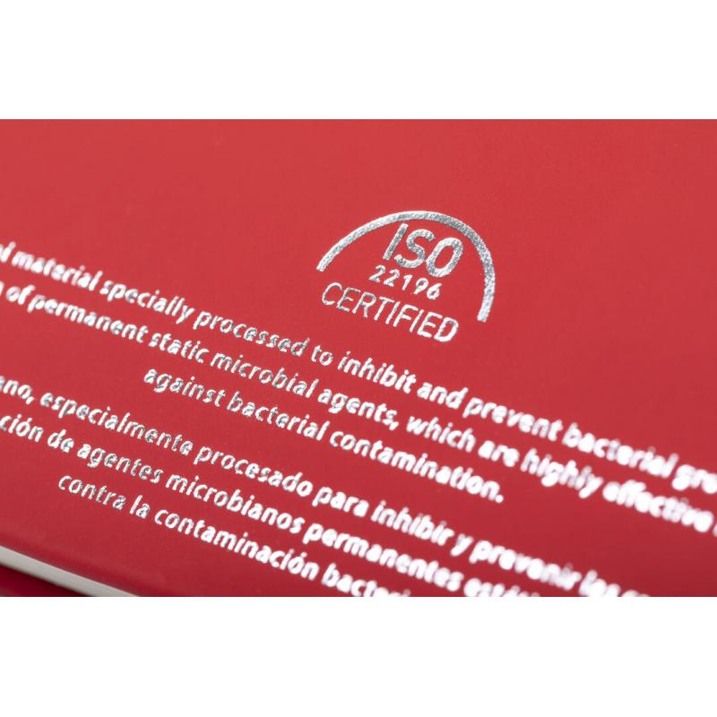 Bloc de notas tamaño A5 con tapas antibacterianas rígidas de polipiel.Disponible en variada gama de colores, con encuadernación cosida. Con banda elástica de cierre y marcapáginas a juego. Incluye 96 hojas de papel lisas en color crema, calidad 70g/m2.Los productos con tratamientos antibacterianos son capaces de reducir drásticamente las cargas bacterianas presentes en las superficies de los materiales, gracias a la incorporación de agentes microbianos permanentes estáticos, con alta efectividad para inhibir y prevenir la contaminación bacteriana.Artículo de acuerdo al estándar ISO 22196, que determina la actividad antibacteriana en materiales plásticos y superficies no porosas, lo que permite conocer la efectividad de inhibición microbiana que tienen los aditivos sobre los objetos tratados mediante una evaluación cuantitativa.