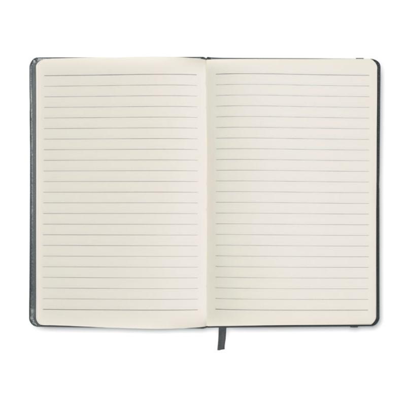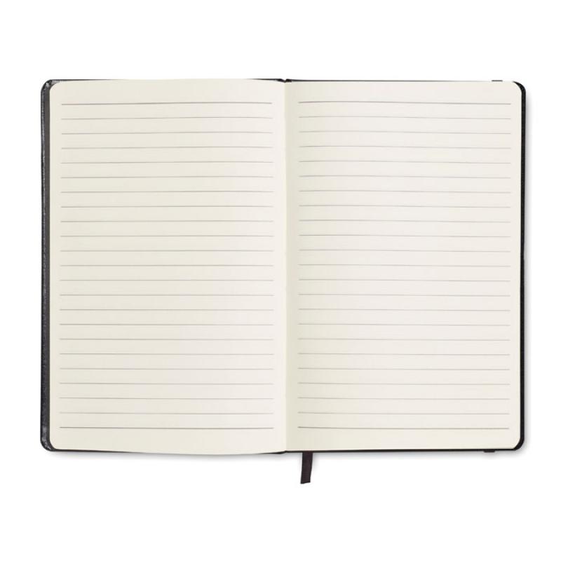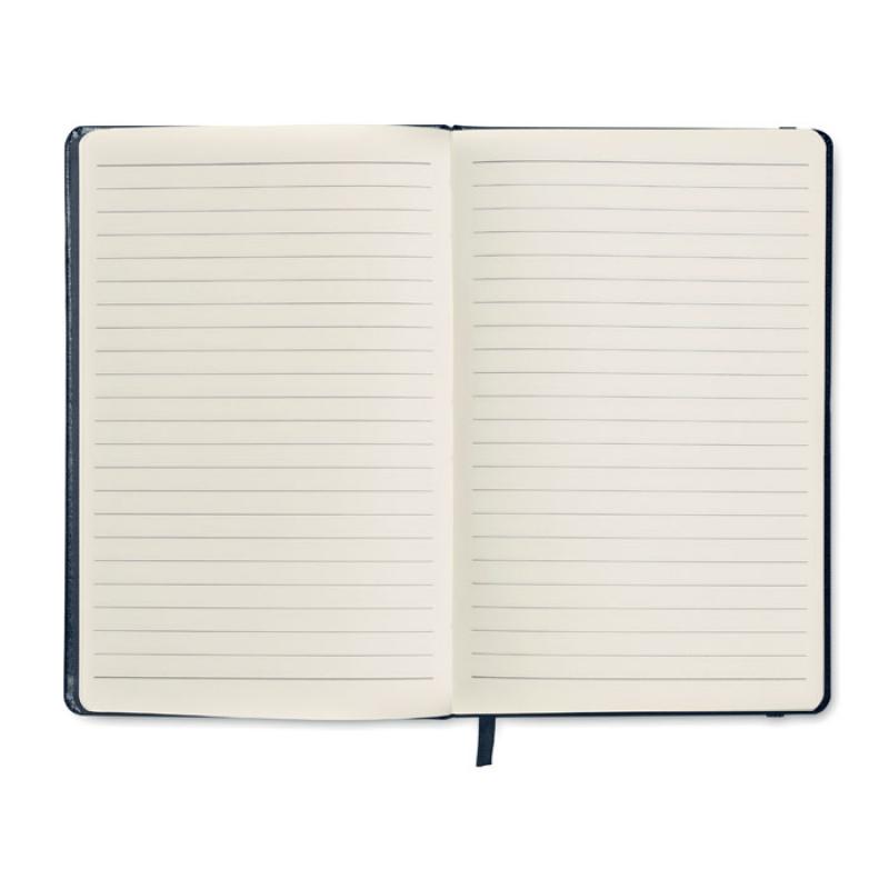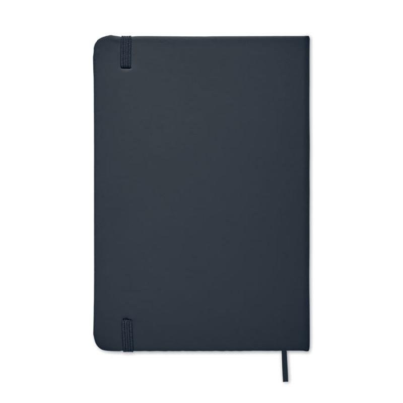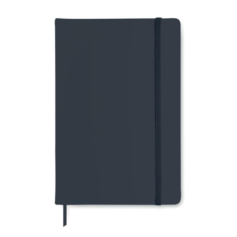 Libreta A5 con tapa rígida de PU de tacto suave. 96 hojas rayadas. Banda elástica y marca páginas.