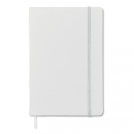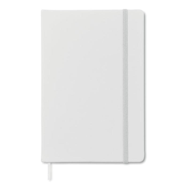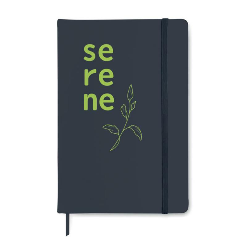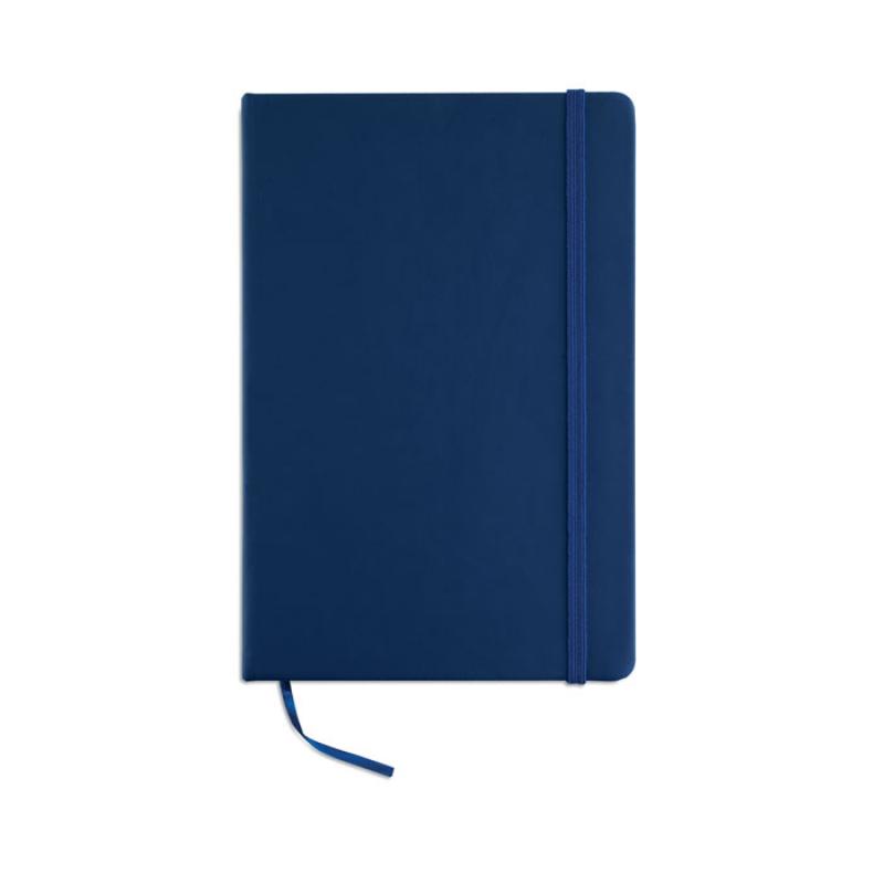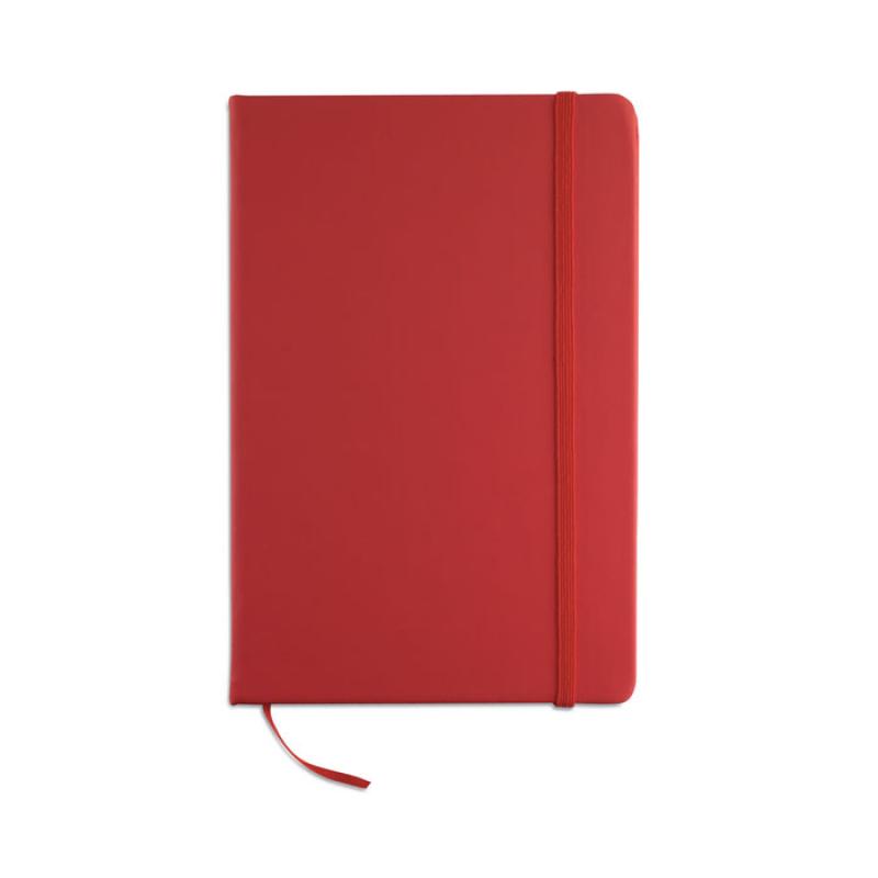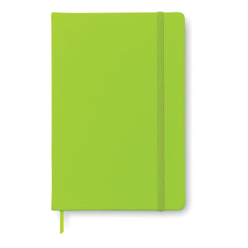 Libreta A5 con tapa rígida de PU de tacto suave. 96 hojas rayadas. Banda elástica y marca páginas.