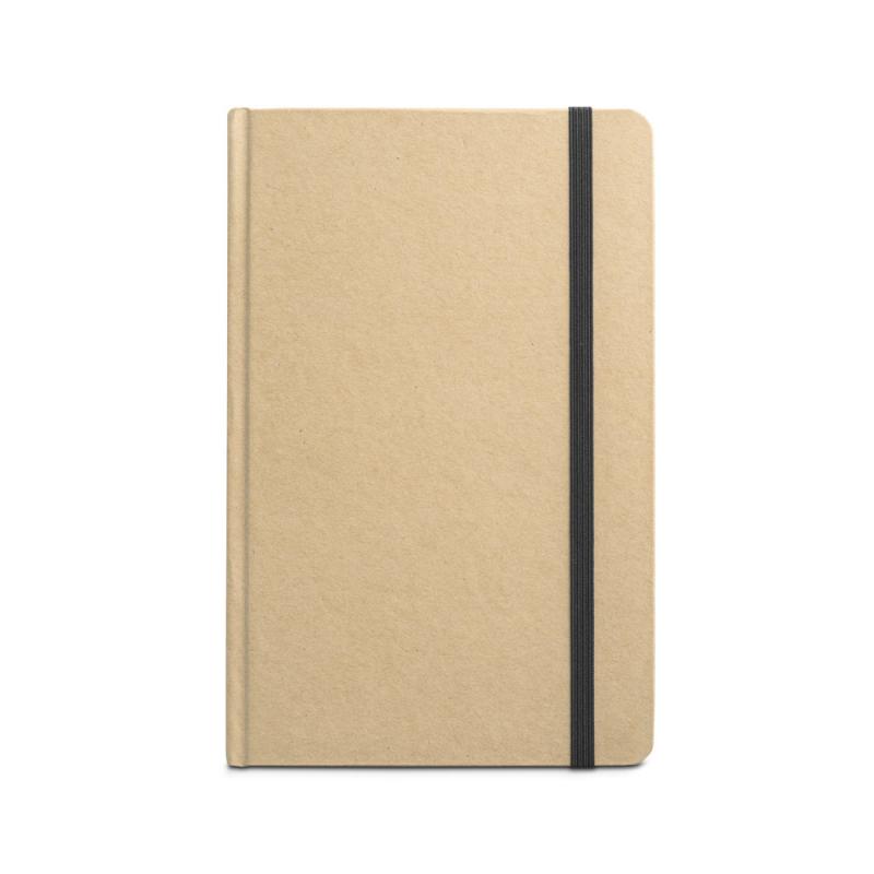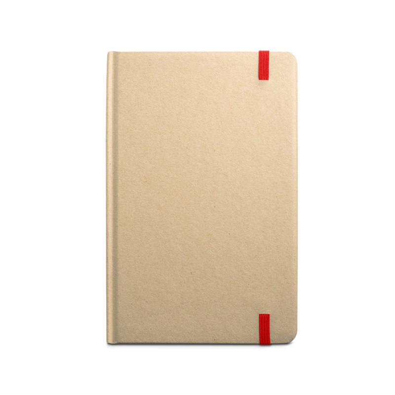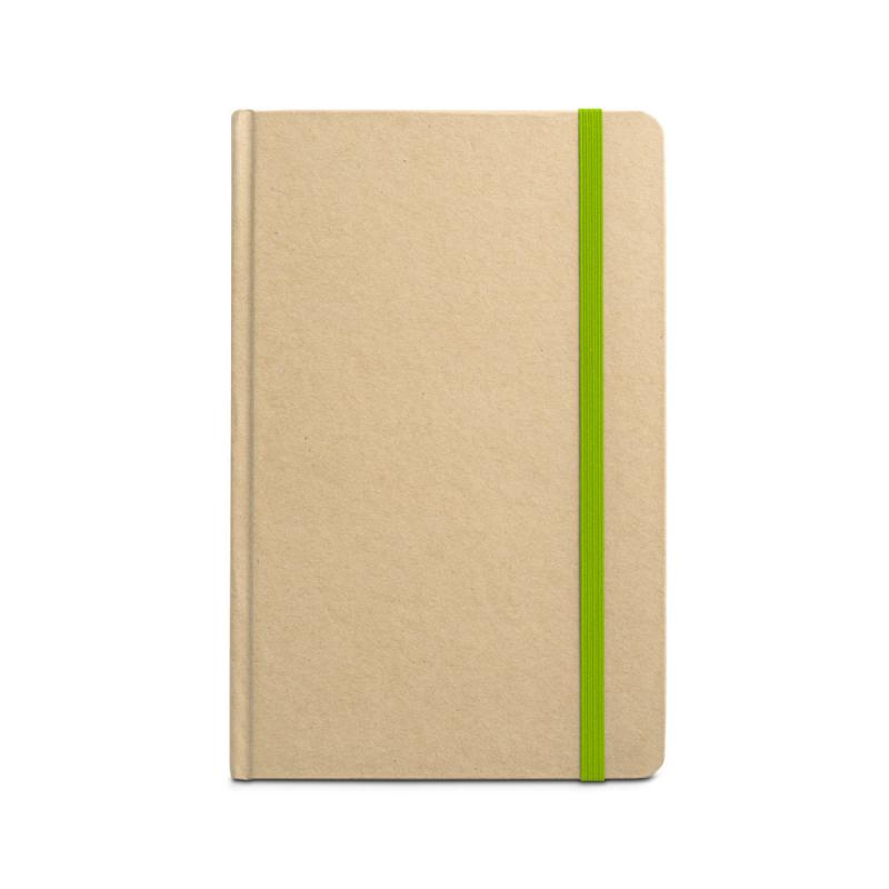 Cuaderno A5 con 160 páginas de papel reciclado rayado y tapa de cartón duro. Contiene cinta elástica y separadora del mismo color.137 x 210 mm