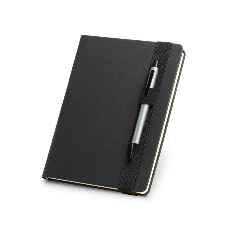 Bloc de notas A5 en polipiel, con funda rígida, soporte para bolígrafo (no incluido), elástico y 280 páginas lisas en color marfil (70g/m2). Se suministra en una bolsa de tela no tejida. Tamaño: 145 x 210 mm | Funda: 185 x 240 mm