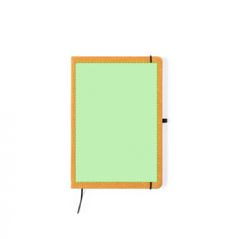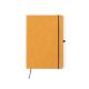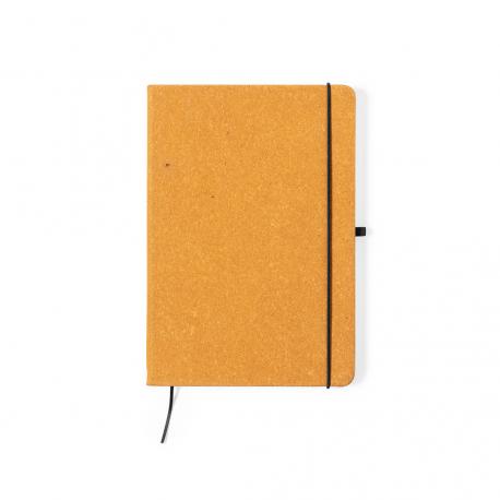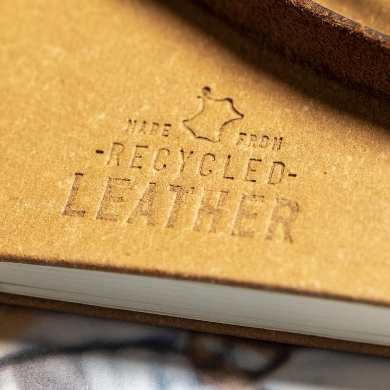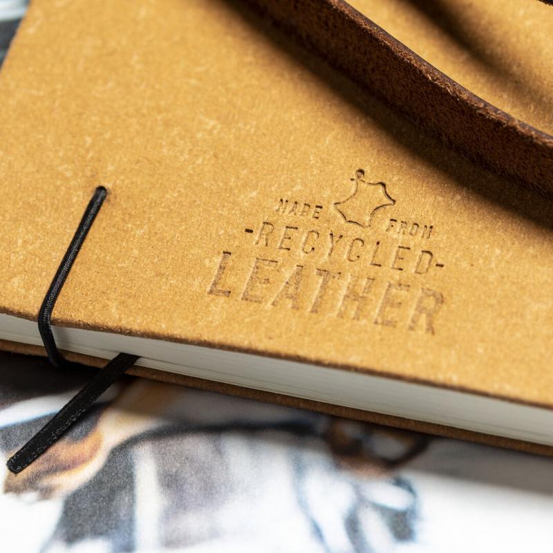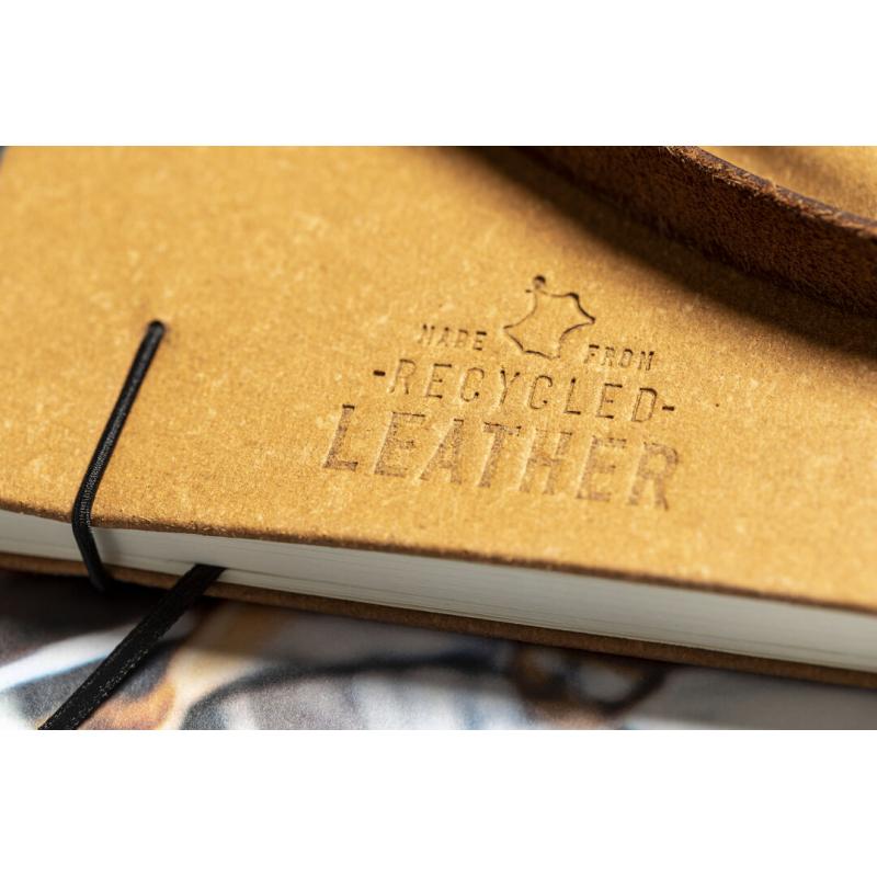 Bloc de notas de línea nature. Con tapas rígidas fabricadas en cuero reciclado, que rescata las fibras desechadas en los procesos de fabricación, minimizando el desperdicio de material, contribuyendo a reducir el impacto ambiental y manteniendo a la vez sus propiedades originales. Interior con 100 hojas de disposición a una raya. Incluye marcapáginas, elástico de cierre y soporte para bolígrafo a juego. Incluye distintivo cuero reciclado.