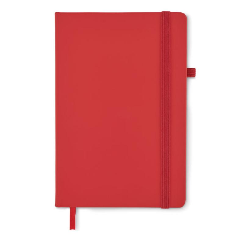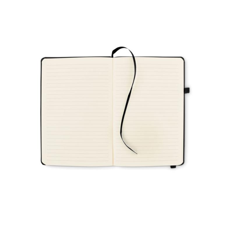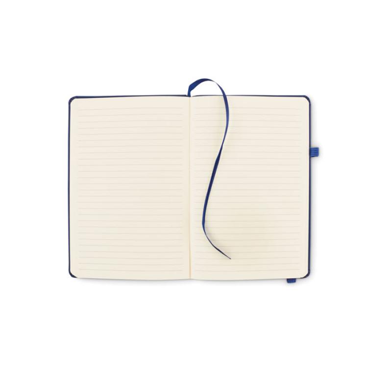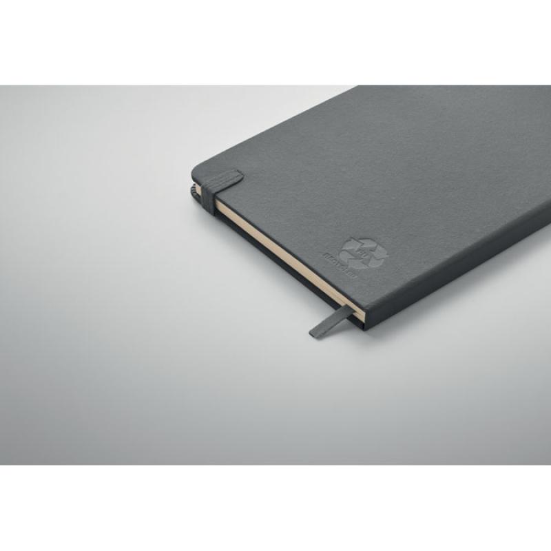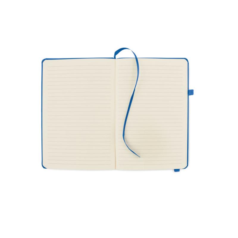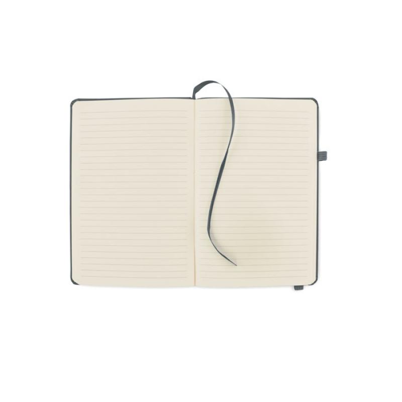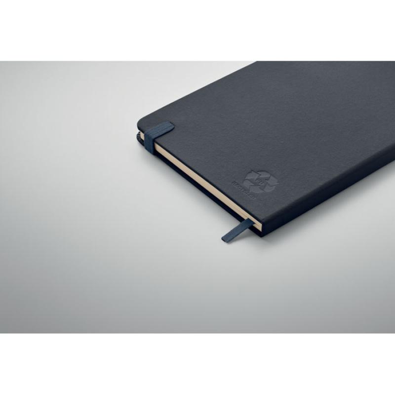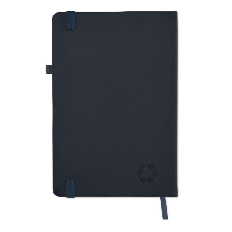 Libreta A5 con tapa rígida de PU reciclado. 96 hojas rayadas de papel reciclado. Banda elástica a juego, marcapáginas y porta bolígrafos.
