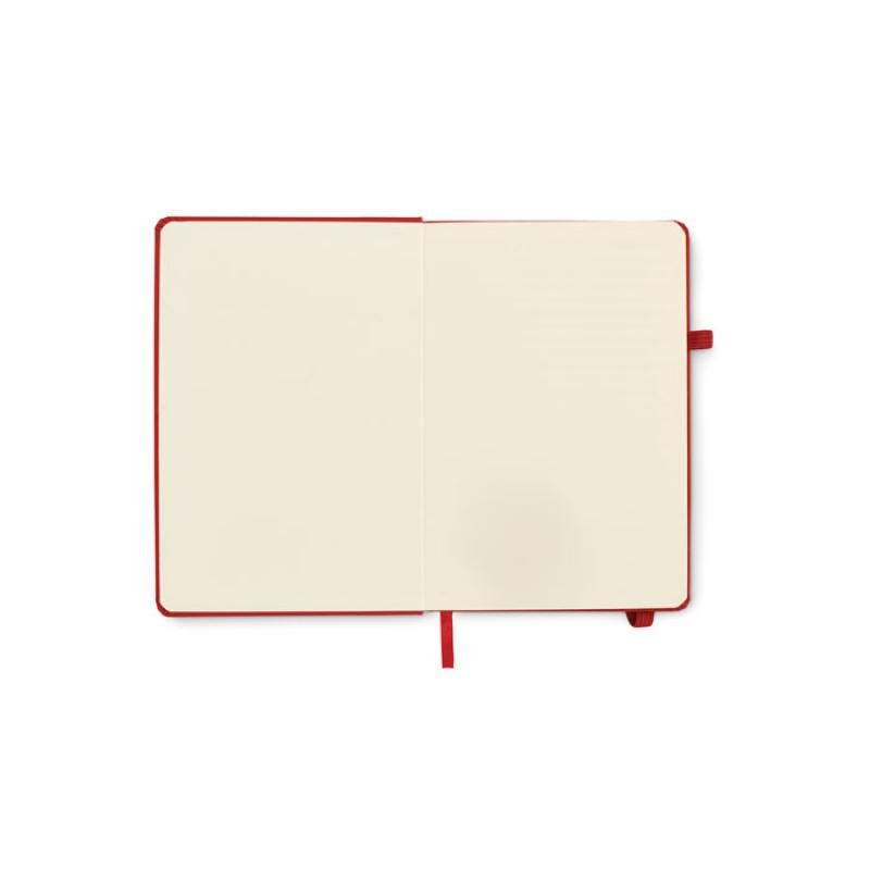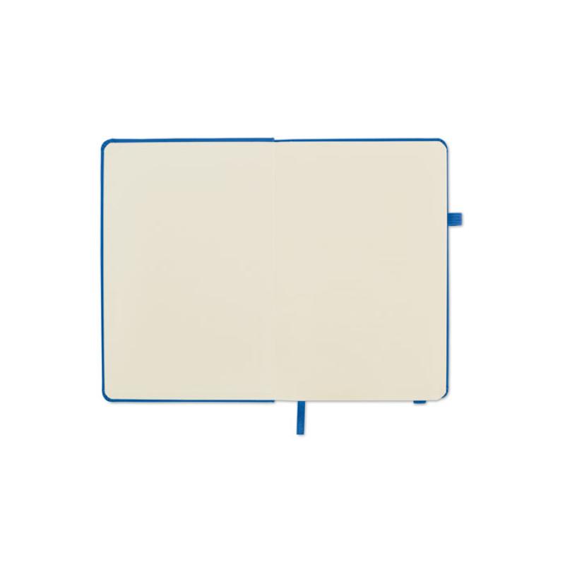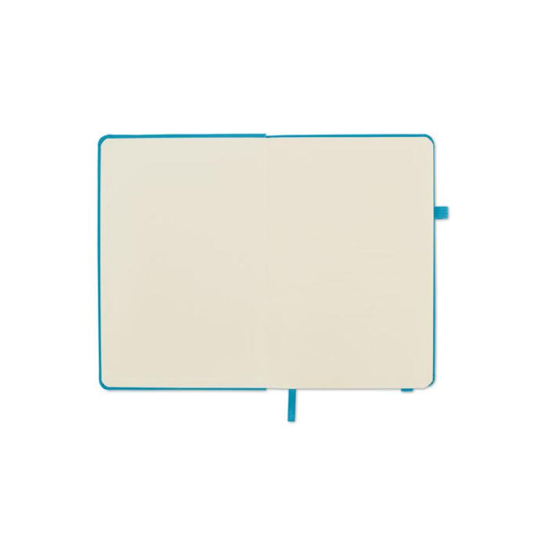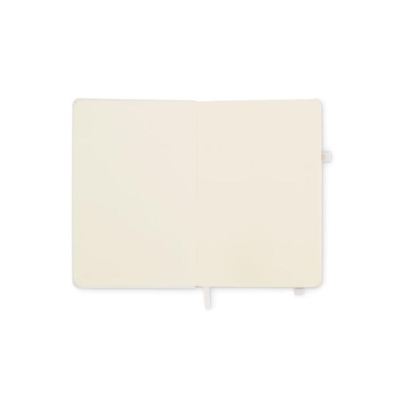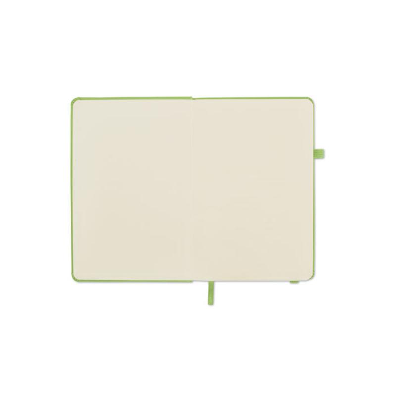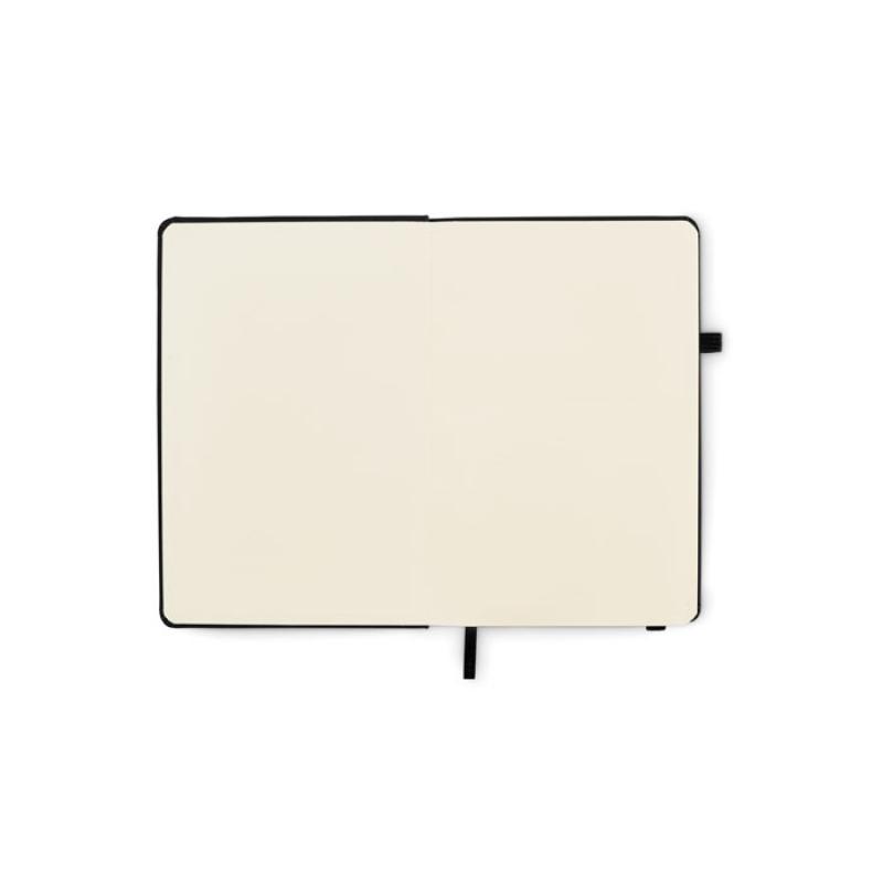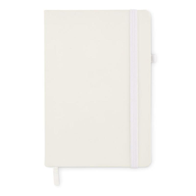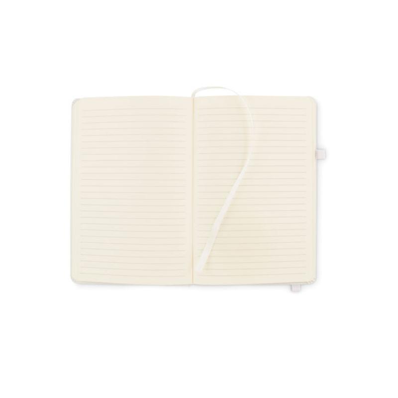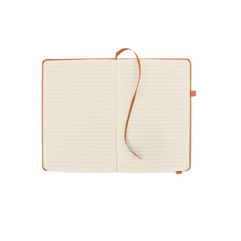 Libreta A5 con tapa rígida de PU reciclado. 96 hojas rayadas de papel reciclado. Banda elástica a juego, marcapáginas y porta bolígrafos.