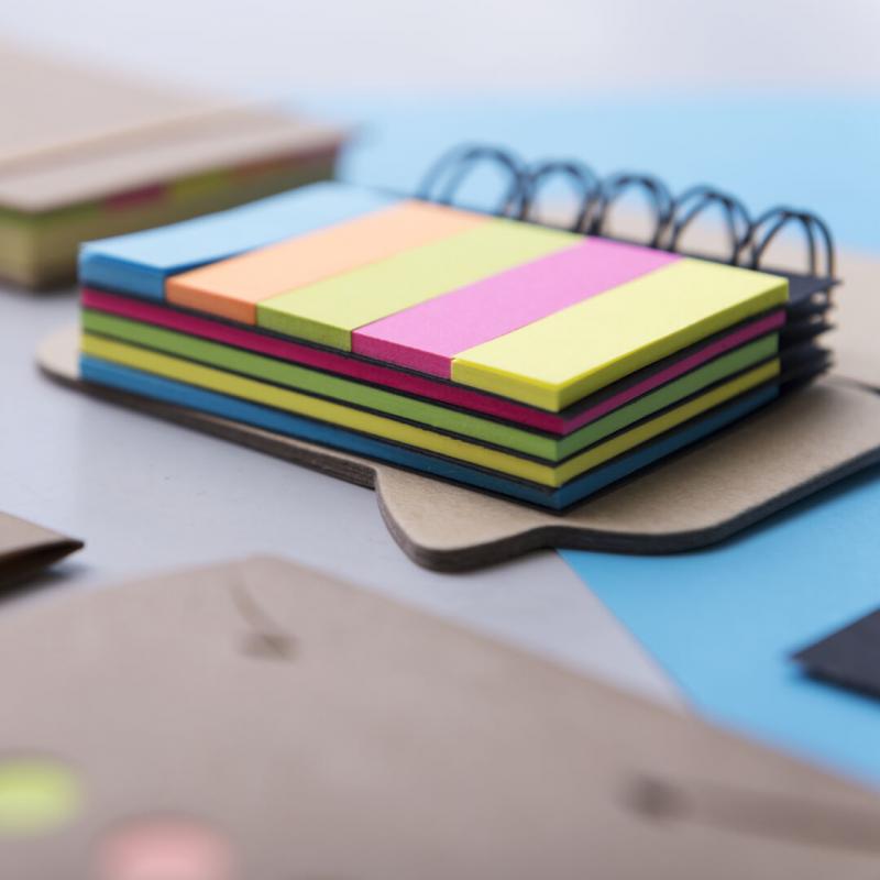 Bloc de notas adhesivas de anillas con tapas de suave tacto acabadas en resistente cartón reciclado rígido. Con 75 notas adhesivas grandes y 125 mini notas adhesivas.