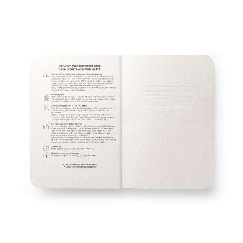 Bloc de notas A5 con tapa semirrígida elaborado a partir de residuos de cascarilla de café. El papel interior está hecho de residuos de algodón y es muy duradero. Contiene 100 páginas rayadas y banda de papel con ilustraciones. No se generaron residuos y no se utilizaron productos químicos ni árboles en el proceso de fabricación de este portátilRecipiente :