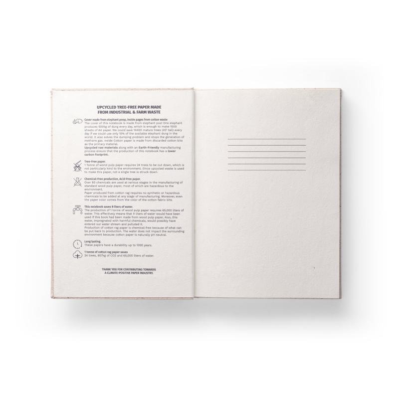 Bloc de notas A5 con tapa dura de materia orgánica de elefante. El papel interior está hecho de residuos de algodón y es muy duradero. Contiene 120 páginas rayadas y banda de papel con ilustraciones. No se generaron residuos y no se utilizaron productos químicos ni árboles en el proceso de fabricación de este bloc de notasRecipiente :
