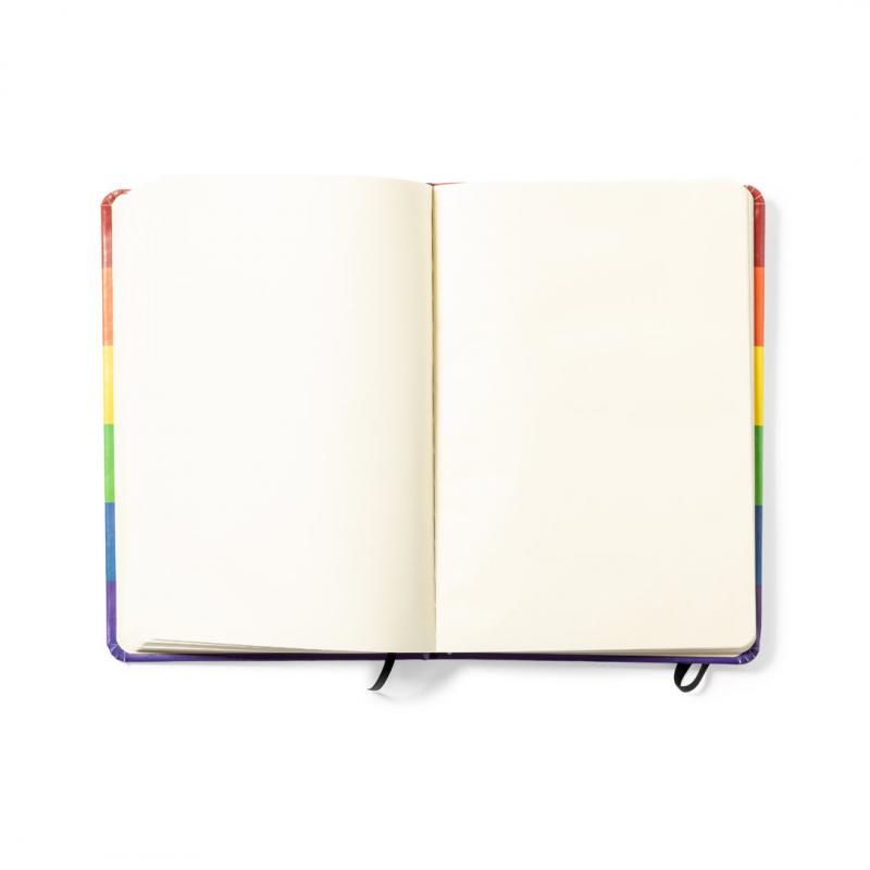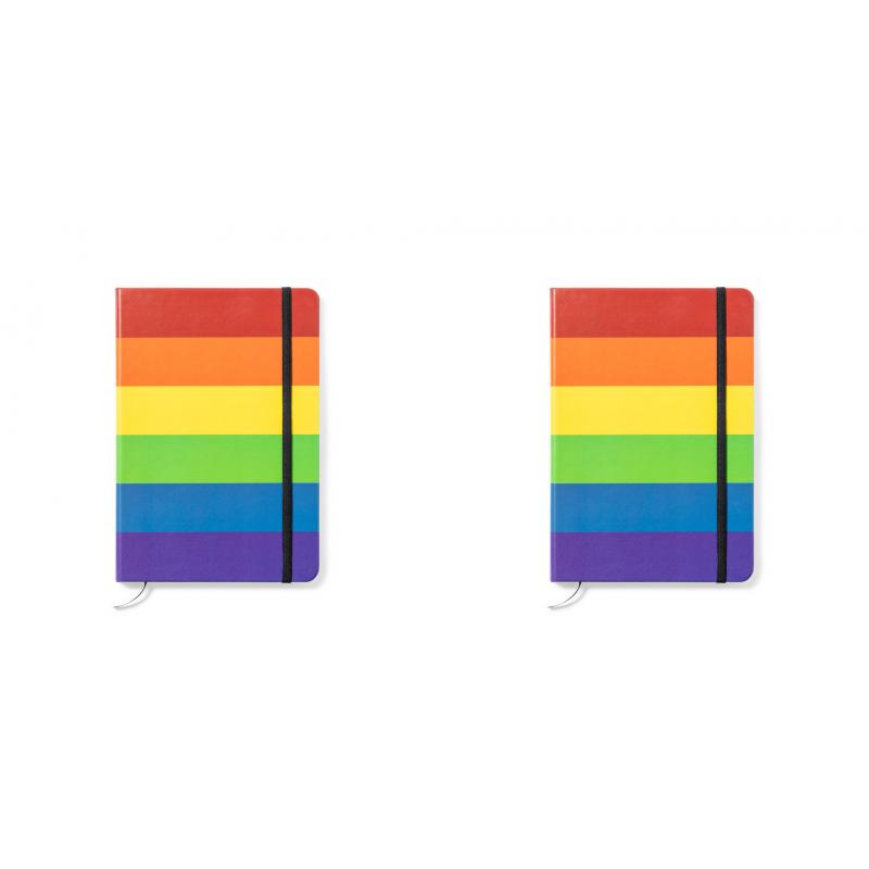 Bloc de notas Rainbow multicolor, con tapas duras en polipiel de suave tacto y elástico de sujeción. Todo un orgullo de bloc de notas, con 100 hojas interiores lisas y marcapáginas de tela.