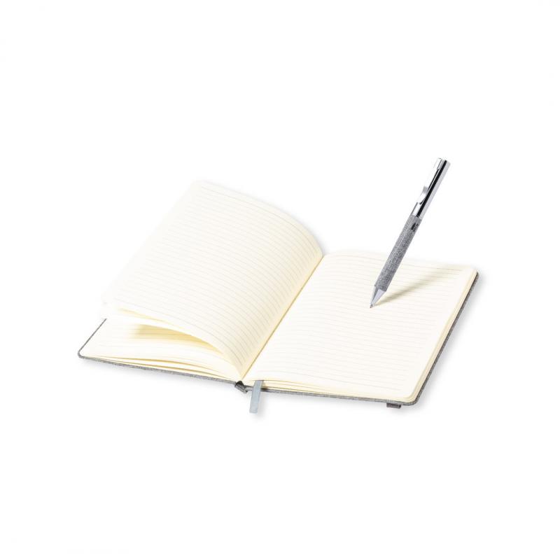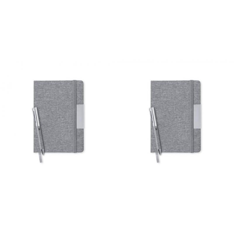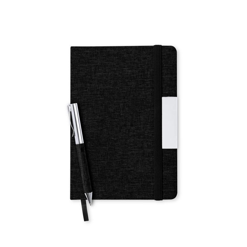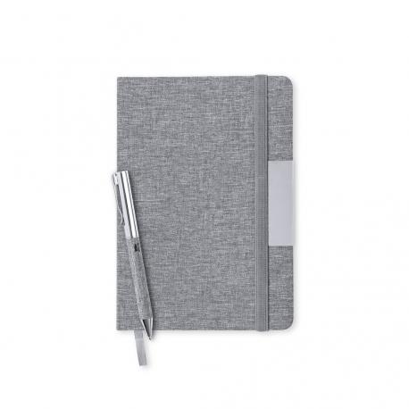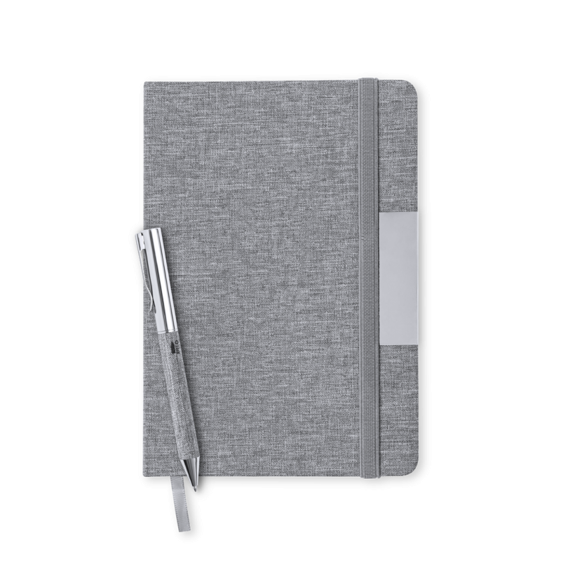 Set de bloc de notas y bolígrafo en RPET, elaborado a partir de plástico reciclado para así fomentar la reutilización de residuos plásticos y ayudar a la sostenibilidad del planeta. Incluye: Bloc de notas de tapas rígidas, con detalle metálico en la portada, marcapáginas de tela y elástico de sujeción a juego. 100 hojas interiores con disposición a una raya y distintivo RPET.Bolígrafo fabricado en metal cromado y con cuerpo recubierto en poliéster RPET. Elegante clip metálico y accesorios a juego, de mecanismo giratorio y en tinta azul. Con distintivo RPET en cuerpo.Set presentado en elegante estuche de diseño en color negro, con compartimento independiente para bloc de notas y bolígrafo.