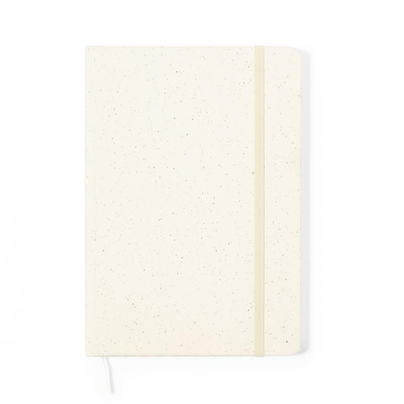 Bloc de notas A5 con tapas duras en resistente cartón reciclado. De 100 hojas blancas lisas y banda elástica para su cierre. Presentado en bolsa individual reciclada.