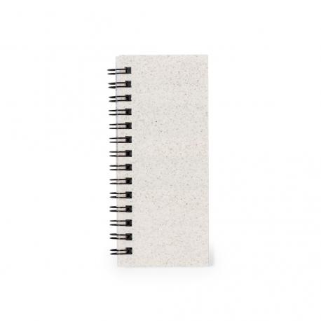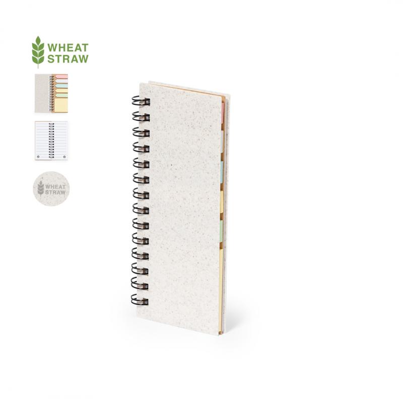 Bloc de notas con tapas en fibra de trigo. Con distintivo wheat straw en la contraportada. Incluye:Bloc de anillas de 30 hojas blancas con disposición a una raya y distintivo reciclado por ambas caras.25 notas adhesivas medianas.125 mininotas adhesivas en varios colores. Elaborado con elementos vegetales para así fomentar la utilización de materias primas naturales y reducir las emisiones contaminantes.Presentado en bolsa individual reciclada.
