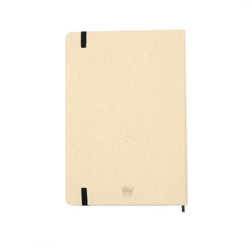 Bloc de notas A5 con tapas duras fabricadas a partir de hierbas recicladas. 80 hojas con disposición a una raya y de acabado kraft, con marcapáginas y banda elástica en color negro. Logotipo Grass Paper en hojas y contraportada. Presentado en una bolsa individual. El papel de hierba es una alternativa perfecta que garantiza la sostenibilidad en su proceso de fabricación, reduciendo el impacto medioambiental debido al rápido crecimiento y a la baja demanda de recursos necesarios para cultivarlo. Además en su elaboración se combina un 50% de base de hierba con otros elementos ecológicos, como madera reciclada.