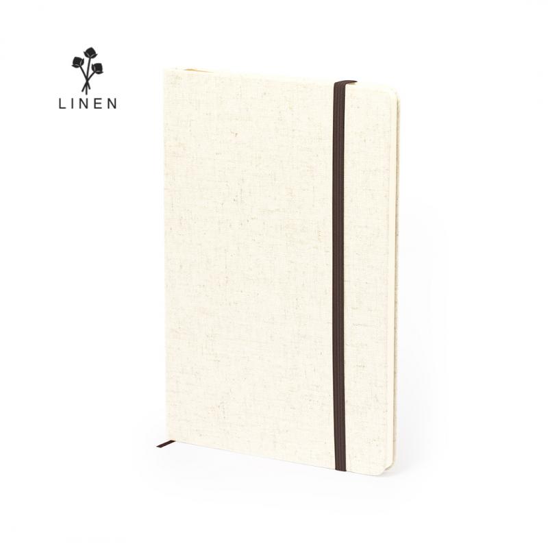 Bloc de notas confeccionado en suave lino. De tapas rígidas, marcapáginas, banda elástica de color marrón y 80 hojas lisas color natural. Con logotipo Lino en contraportada. Presentado en bolsa individual. Elaborado con elementos vegetales para así fomentar la utilización de materias primas naturales y reducir las emisiones contaminantes.