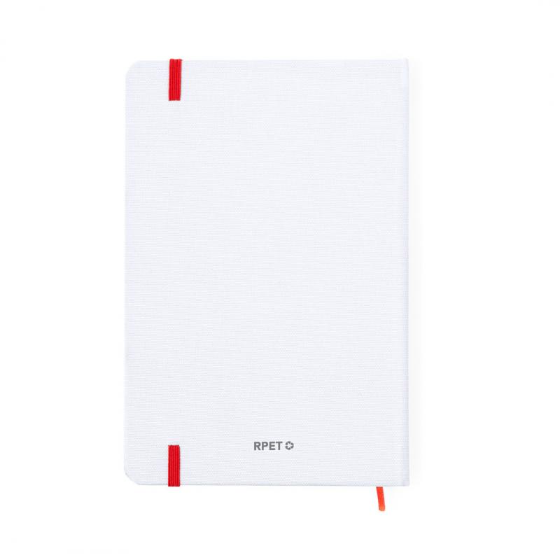 Bloc de notas con tapas rígidas elaboradas con RPET 600D. Con portada y contraportada en blanco, de 100 páginas en lisas, con banda elástica y marcapáginas en variados y vivos colores. Especialmente diseñado para marcaje a todo en sublimación. Con logotipo RPET en contraportada. Presentado en bolsa individual. El material RPET se elabora a partir de plástico reciclado, para así fomentar la reutilización de residuos plásticos y ayudar a la sostenibilidad del planeta.