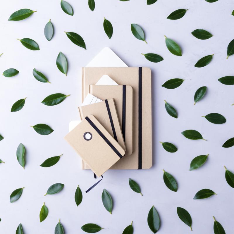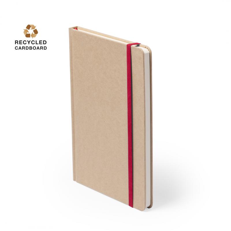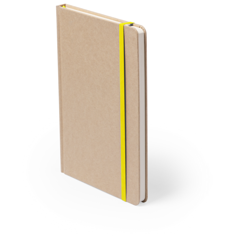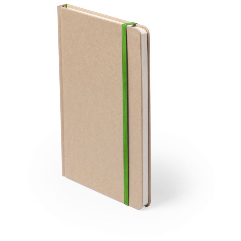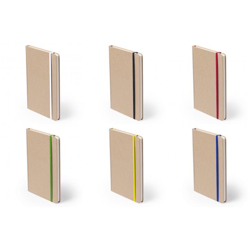 Bloc de notas A5 con tapas duras en resistente cartón reciclado. De 100 hojas blancas lisas y banda elástica para su cierre. Disponible en variada gama de colores.
