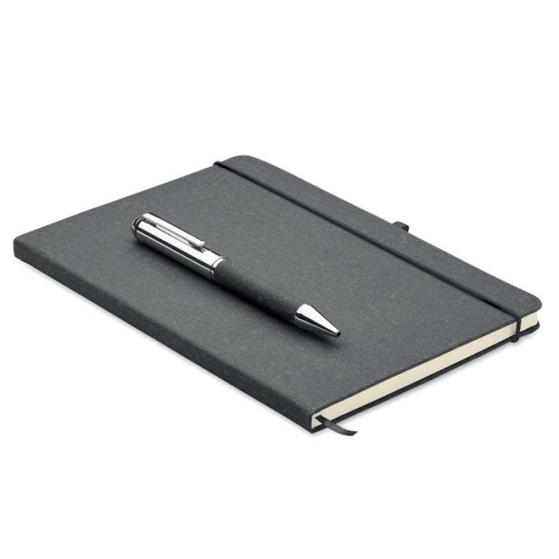 Set de regalo. Libreta A5 de piel reciclada (75%) con tapa dura. 160 páginas rayadas (80 hojas). Banda elástica a juego, cinta marcapáginas y portabolígrafos. Bolígrafo metálico giratorio a juego. Tinta azul. Presentado en caja de papel kraft.Recipiente :