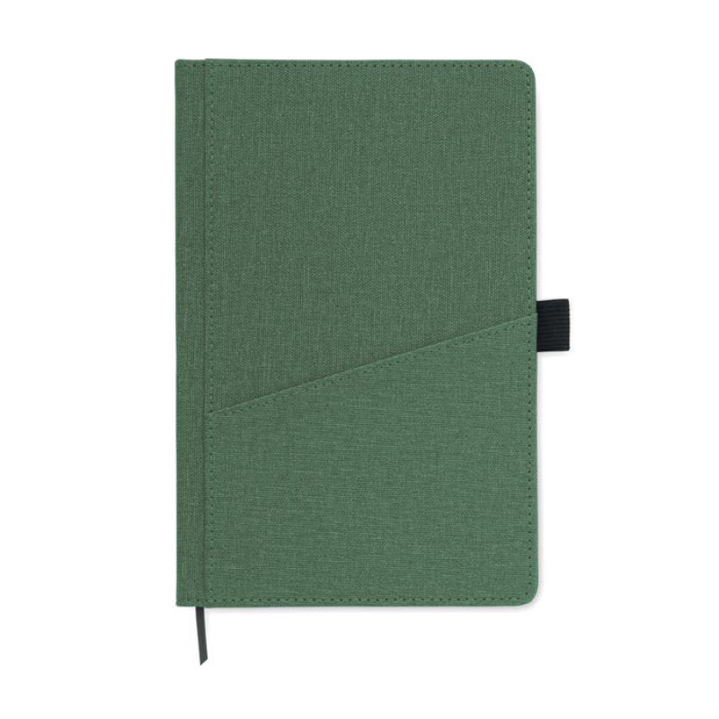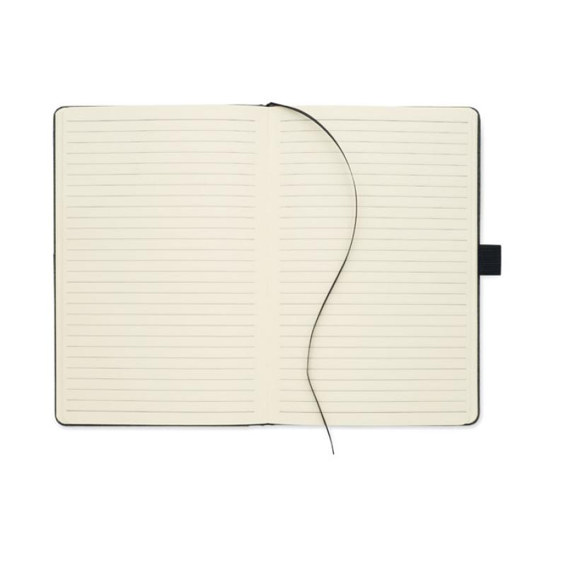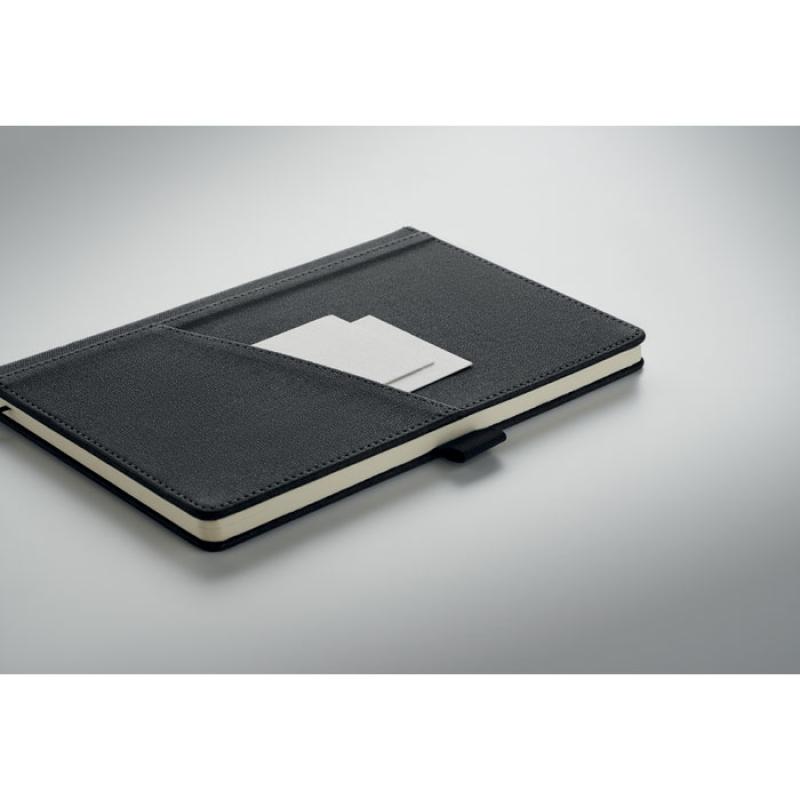 Libreta A5 con tapa dura de PU y bolsillo frontal para teléfono. Encuadernado en cartoné. 160 páginas rayadas de papel reciclado (80 hojas). Marcapáginas de cinta a juego.Recipiente :