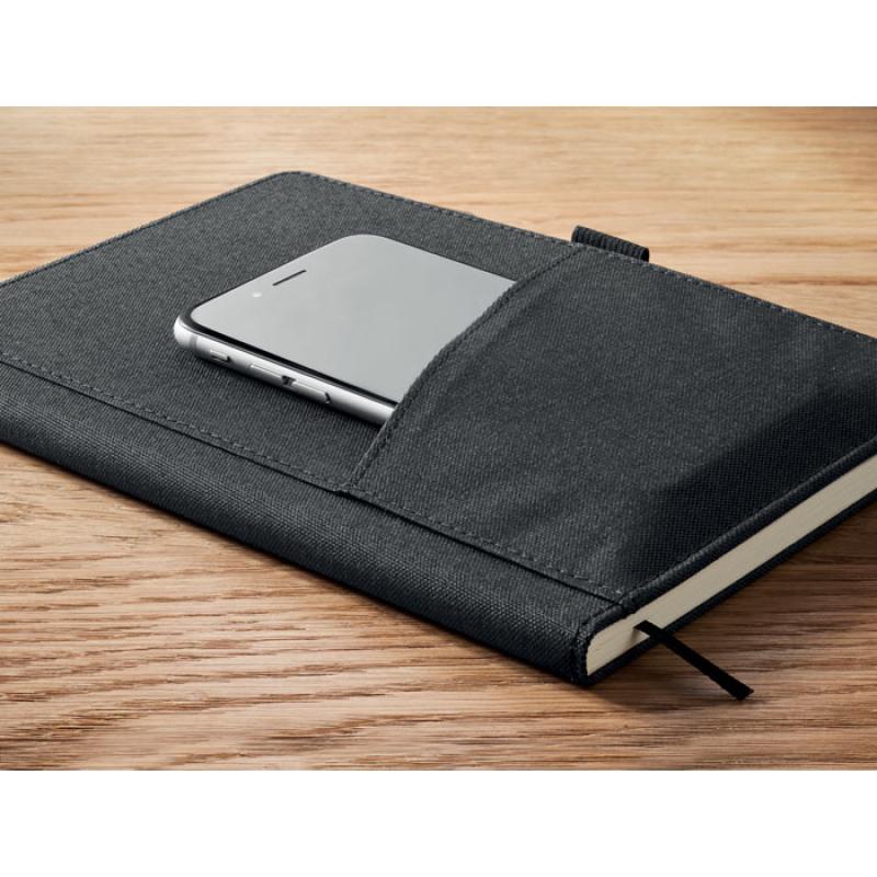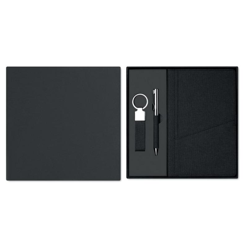 Set de regalo de 3 piezas en caja de regalo. Incluye bolígrafo giratorio de metal con detalle de poliéster RPET, cuaderno de tapas duras RPET con bolsillo frontal para smartphone y llavero de poliéster RPET. Tinta azul.Recipiente :