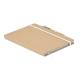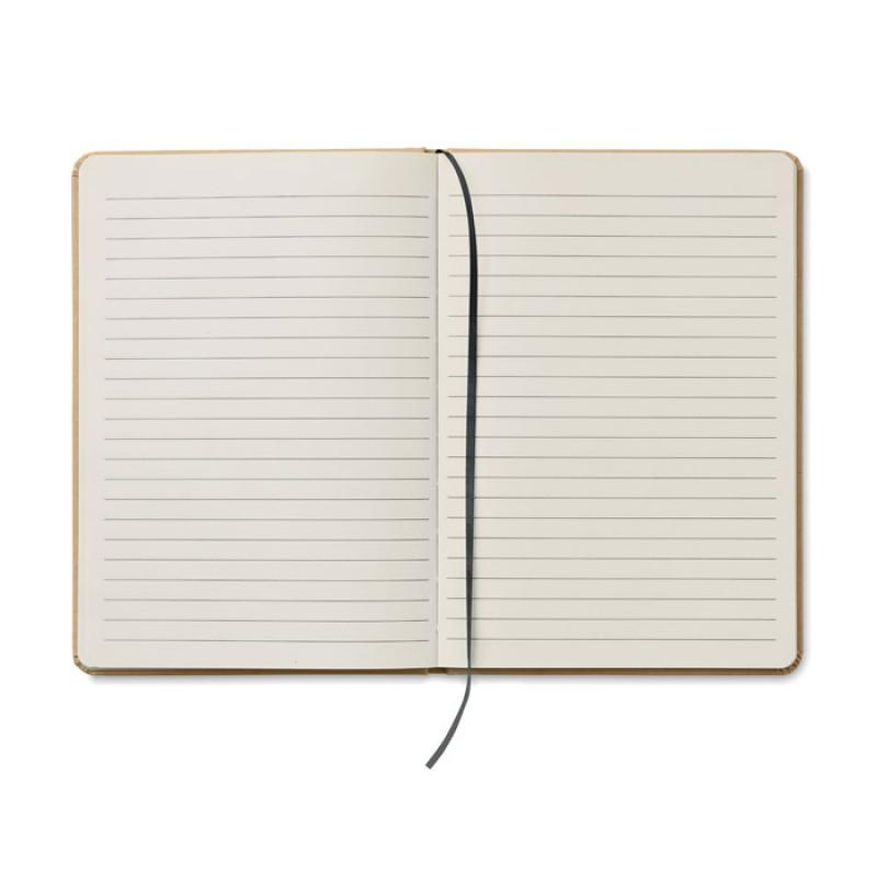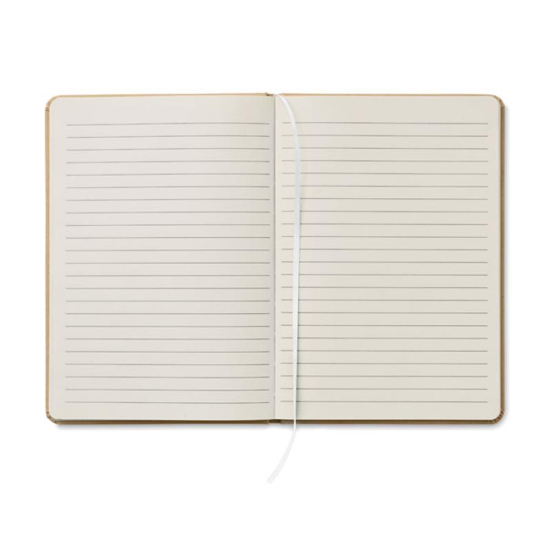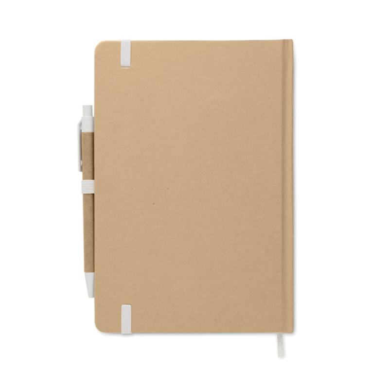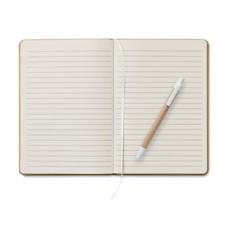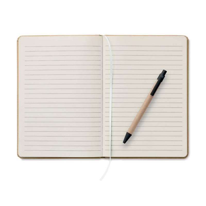 Libreta A5 con tapa de cartón reciclado duro. 160 páginas rayadas (80 hojas de papel reciclado). Cinta elástica de cierre y portabolígrafo, marcapáginas. Incluye bolígrafo con pulsador y cuerpo de papel reciclado. Tinta azul.Recipiente :