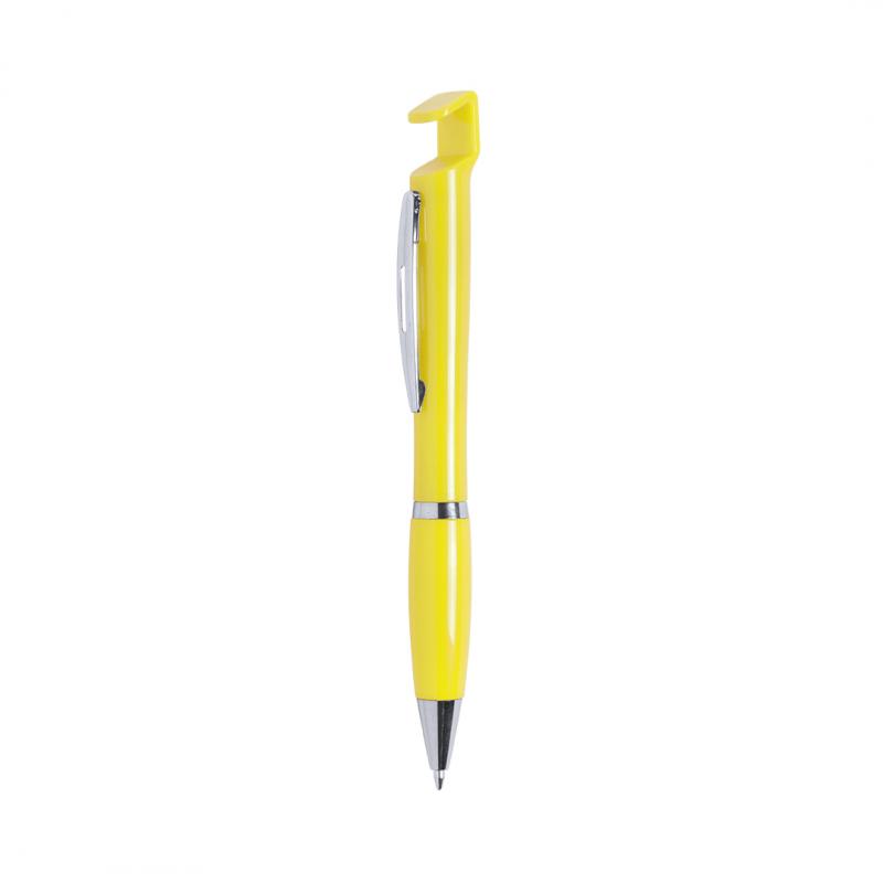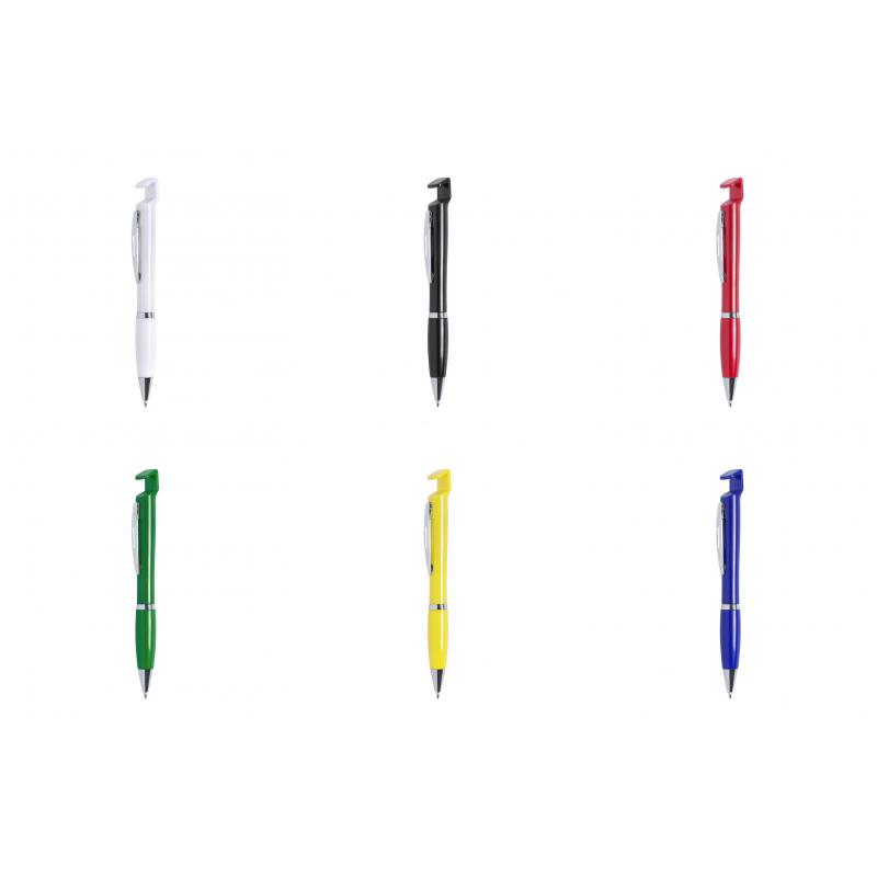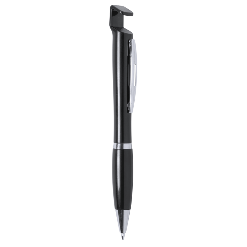 Bolígrafo con soporte para dispositivo móvil. De mecanismo pulsador y atrevido diseño bicolor con accesorios en color plateado y cuerpo de suave acabado en divertidos colores sólidos. Con original clip metálico troquelado a juego y cómoda empuñadura. Tinta azul.