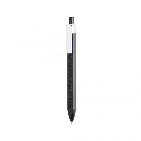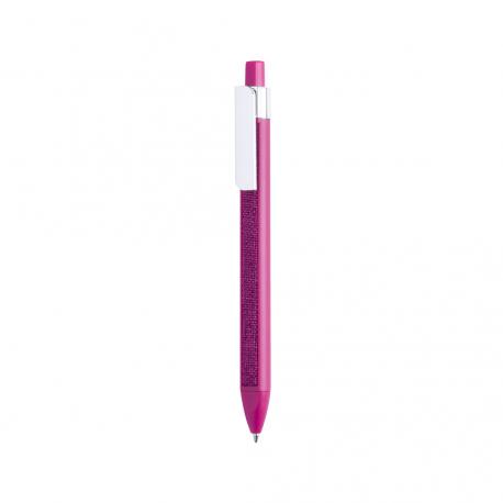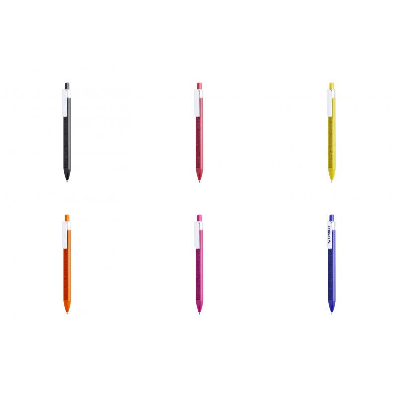 Original bolígrafo de mecanismo pulsador con diseño cuadrangular y suave tira de tela a juego integrada en cuerpo. En variada gama de vivos colores y con clip rectangular para marcaje. Tinta azul.
