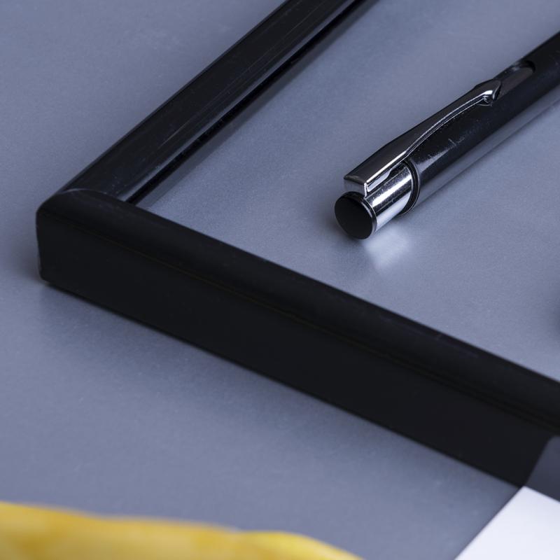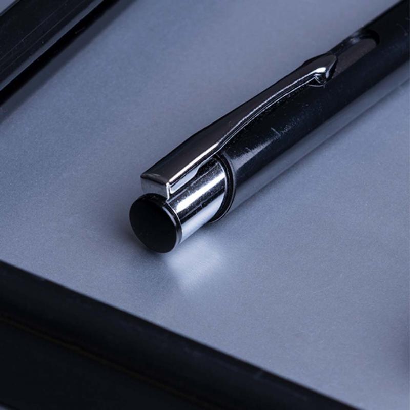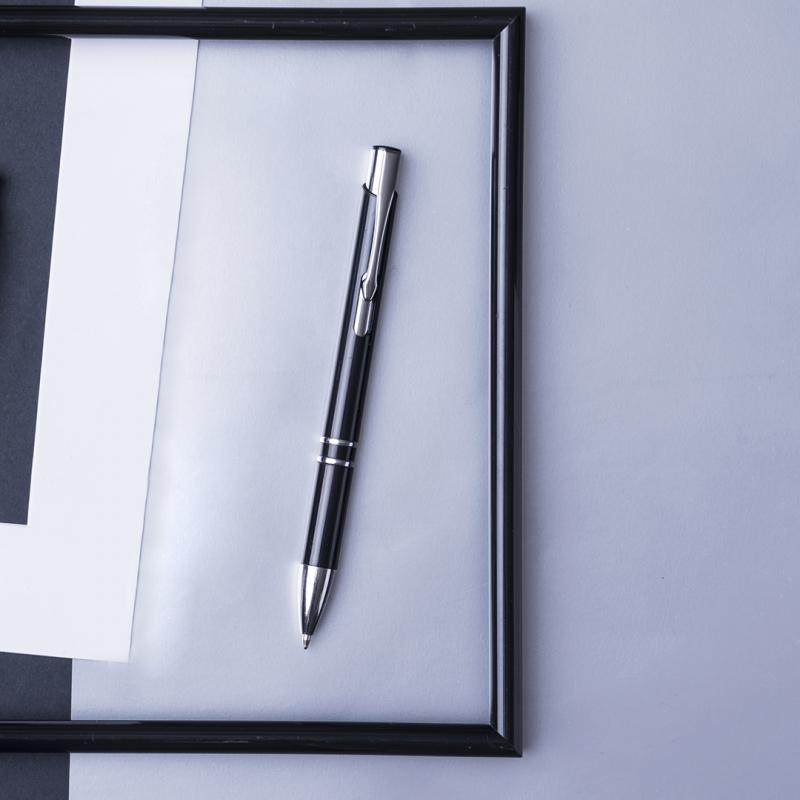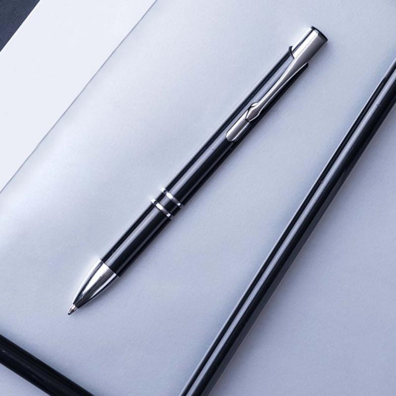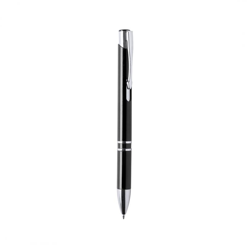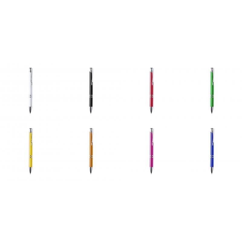Bolígrafo con cuerpo en brillantes colores. Detalles en cromado y original muesca en cuerpo. De mecanismo pulsador, con cartucho jumbo y tinta azul.