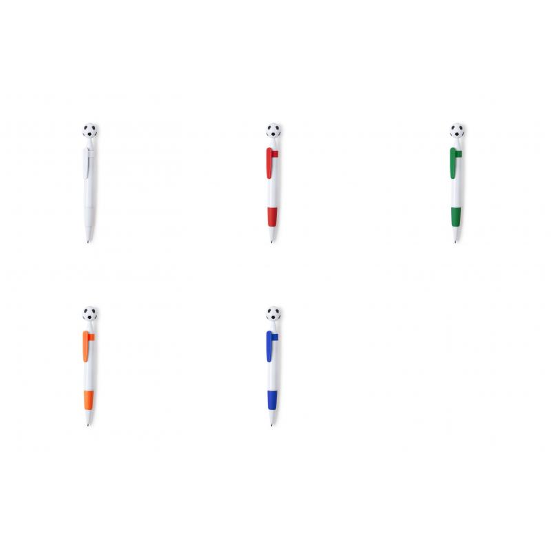 Bolígrafo para los más futboleros con detalle en forma de balón. De mecanismo pulsador y en desenfadado diseño bicolor. Con cuerpo en color blanco, con clip y empuñadura a juego, en variada gama de colores. Amplia superficie de impresión y en tinta azul.