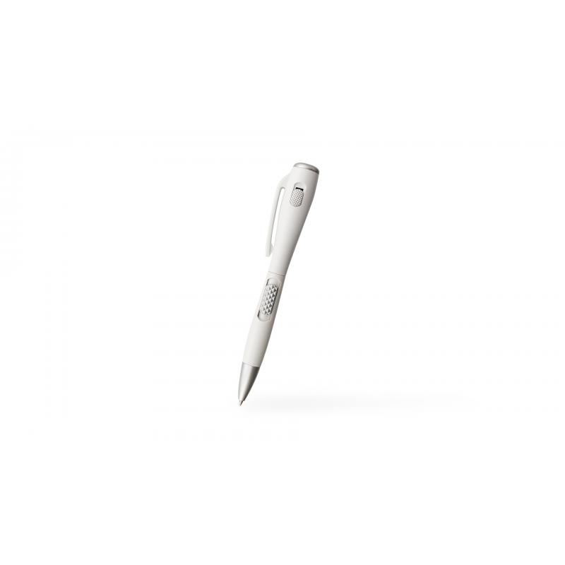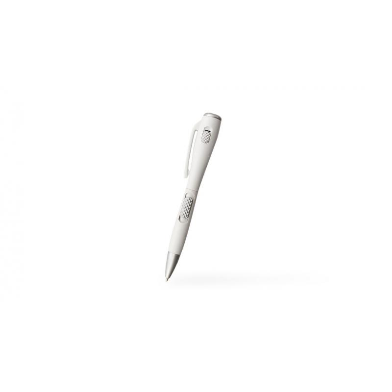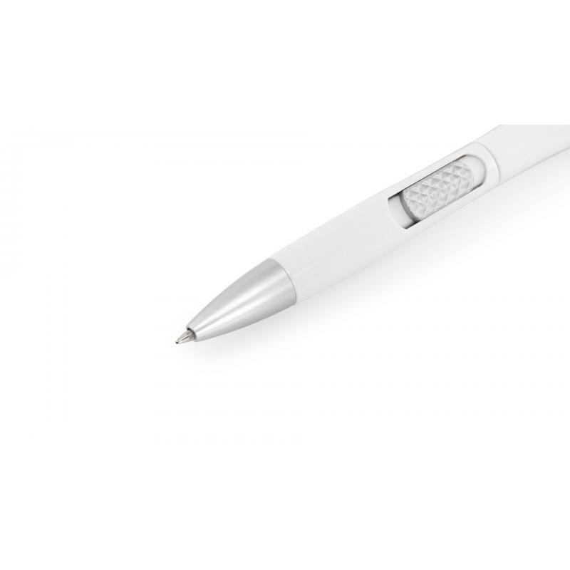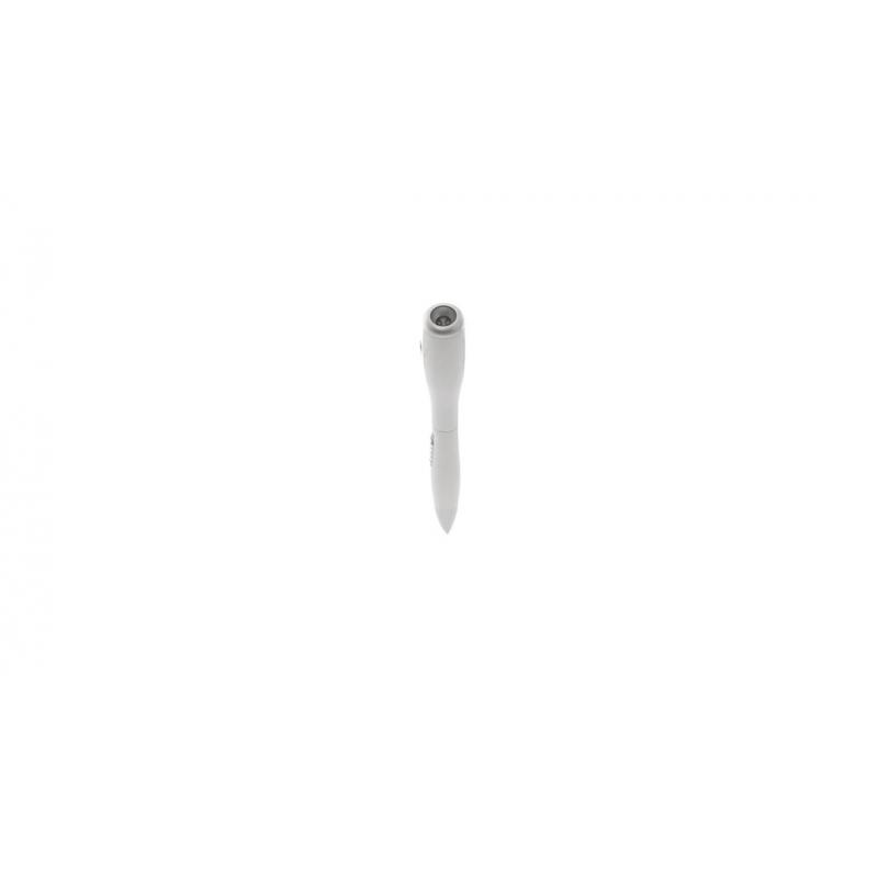 Bolígrafo con linterna led integrada. De mecanismo pulsador lateral y en diseño minimalista de original combinación de colores gris y blanco. En tinta azul y con pilas de botón incluidas.