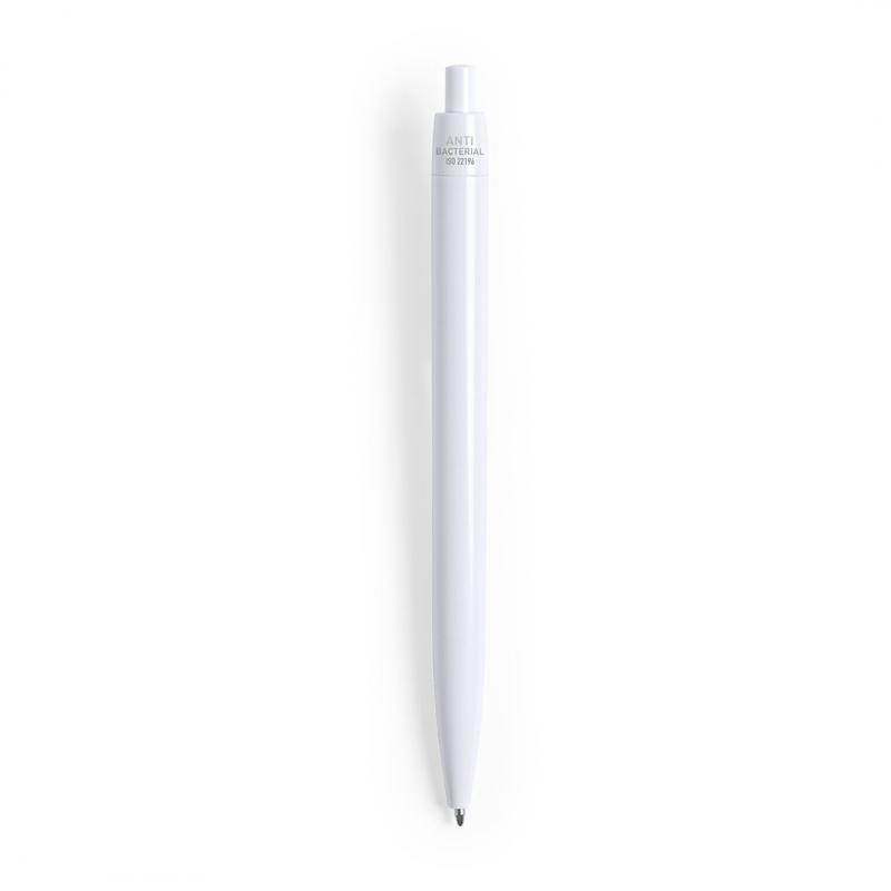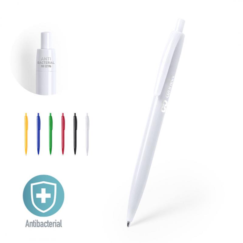 Bolígrafo antibacteriano de mecanismo pulsador. Diseño monocromático, en variada gama de colores con acabado brillante, especialmente diseñado para marcaje en tampografía. Tinta azul. Los productos con tratamientos antibacterianos son capaces de reducir drásticamente las cargas bacterianas presentes en las superficies de los materiales, gracias a la incorporación de agentes microbianos permanentes estáticos, con alta efectividad para inhibir y prevenir la contaminación bacteriana. Artículo de acuerdo al estándar ISO 22196, que determina la actividad antibacteriana en materiales plásticos y superficies no porosas, lo que permite conocer la efectividad de inhibición microbiana que tienen los aditivos sobre los objetos tratados mediante una evaluación cuantitativa.