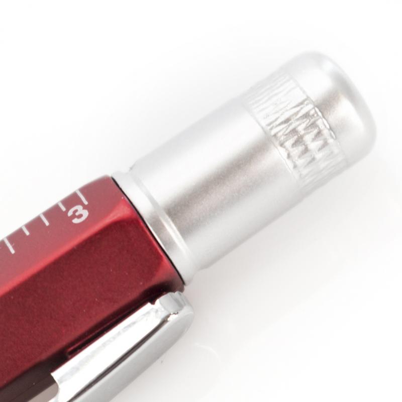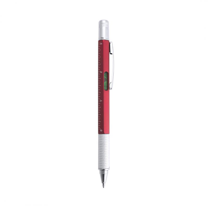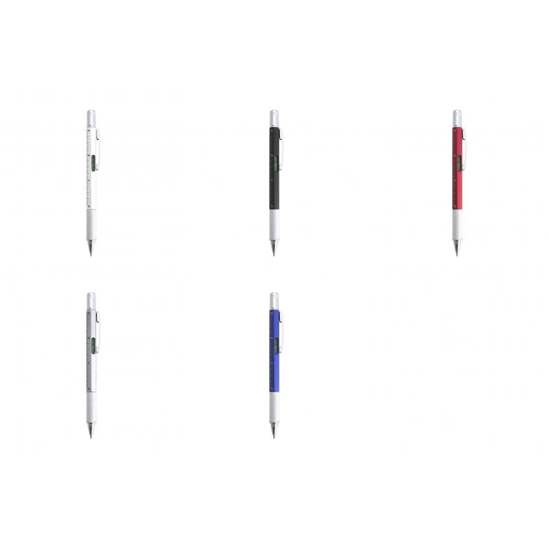 Bolígrafo multiherramienta 4 en 1 de mecanismo giratorio, en variados colores y con suave empuñadura. Con nivel integrado en cuerpo, regla con sistema métrico en centímetros/pulgadas y destornillador de doble cabeza -plana y de estrella-. Con clip metálico y tinta azul.