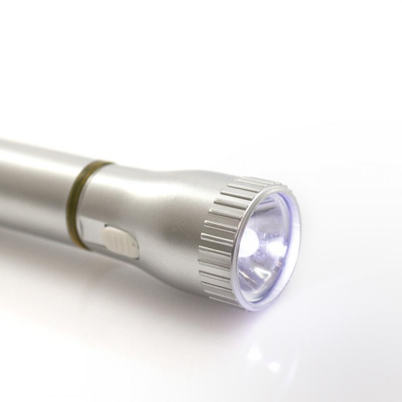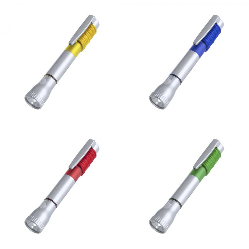 Boligrafo con linterna led integrada. De original diseño bicolor y cuerpo en suave acabado de color plateado. Capucha translúcida en vivos colores con cinta de transporte a juego. En tinta azul y con pilas de botón incluidas.