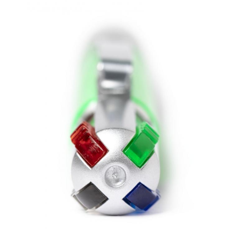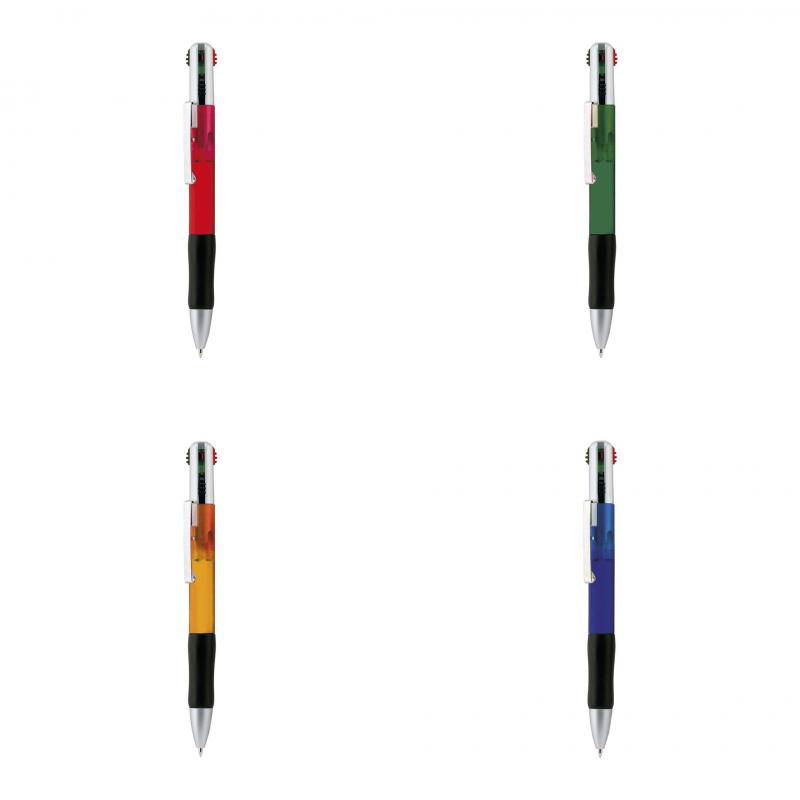 Bolígrafo 4 en 1 de mecanismo pulsador retráctil, de clásico diseño y cuerpo de suave acabado translúcido en vivos colores. Con accesorios en plateado y suave empuñadura ergonómica en color negro. De 4 cartuchos en tintas azul, roja, negra y verde.