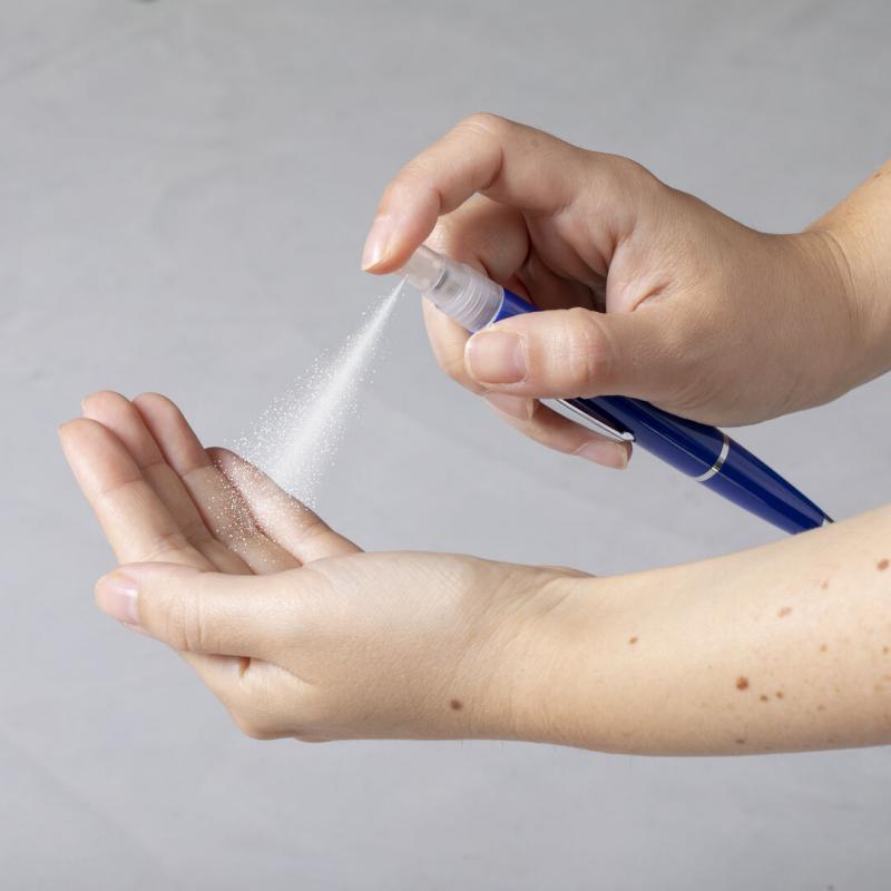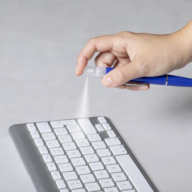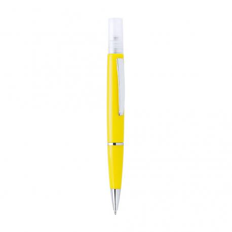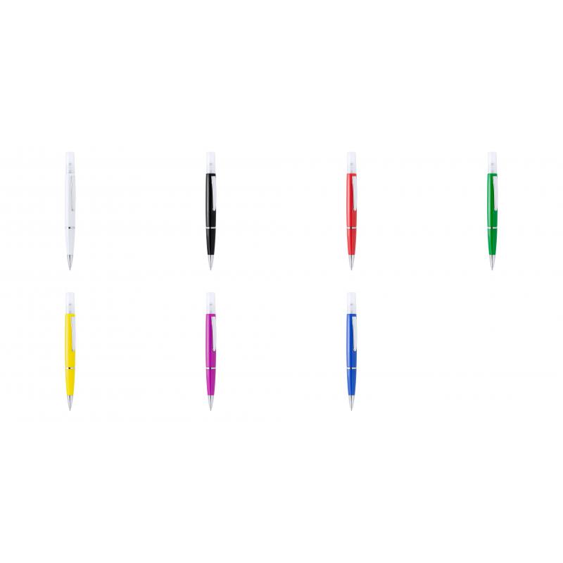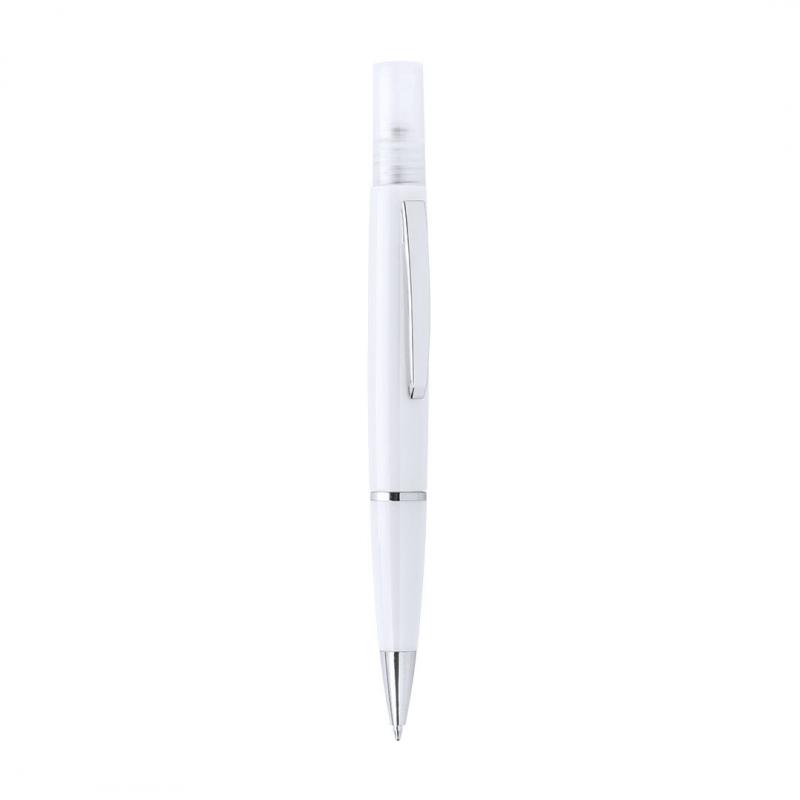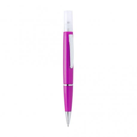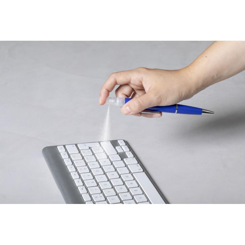 Bolígrafo higienizante con pulverizador recargable integrado y capucha protectora. Acabado en resistente ABS brillante con elegante clip metálico y cómoda empuñadura y escritura en tinta azul. Capacidad del pulverizador 3ml. Líquido no incluido. Disponible en amplia y variada gama de colores.