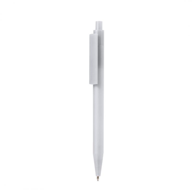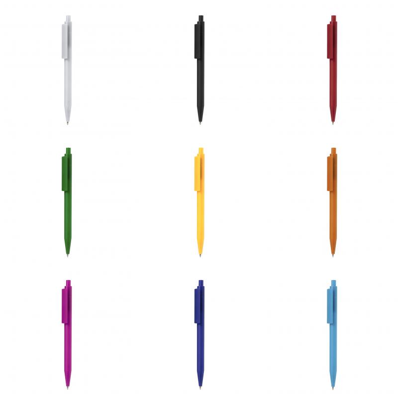 Bolígrafo de mecanismo pulsador fabricado en resistente ABS. Disponible en variada gama de colores, con clip plano y en tinta azul.