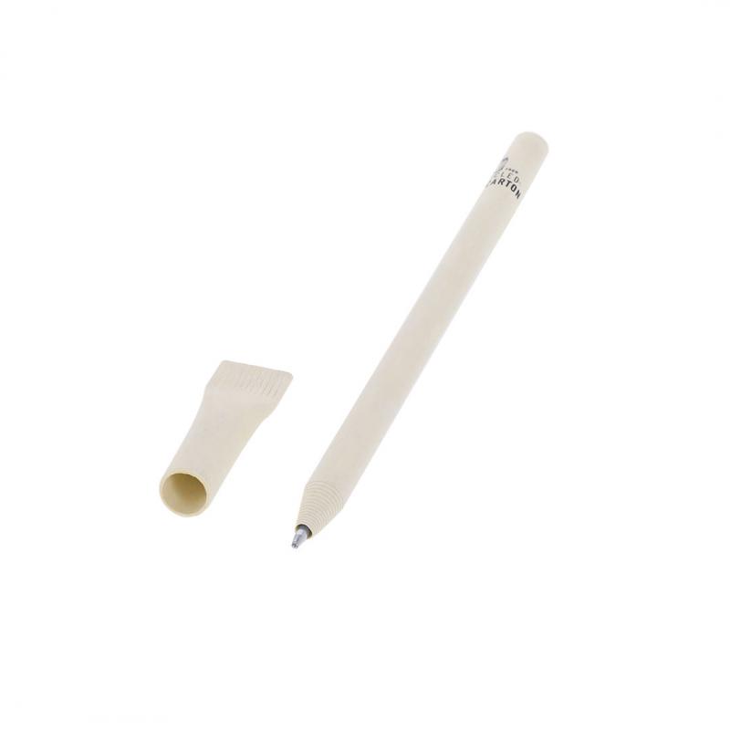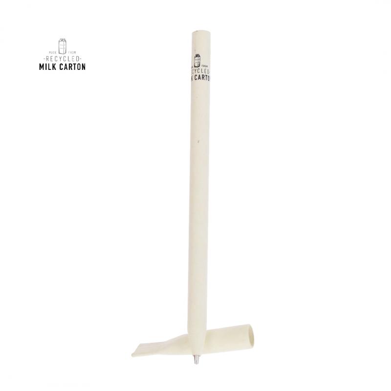 Bolígrafo con cuerpo fabricado con cartones de leche reciclados y detalles en color blanco. Con cierre de capucha y en tinta azul, con distintivo cartón de leche reciclado en el cuerpo.Los cartones de leche se componen en su mayor parte de cartón y aluminio. Durante su proceso de reciclado, se separan los distintos materiales del envase para su reutilización y nuevo uso, contribuyendo así a recorrer el camino infinito de la economía circular. Este material se caracteriza por su alto grado de reciclabilidad, así como por su ligereza y resistencia.